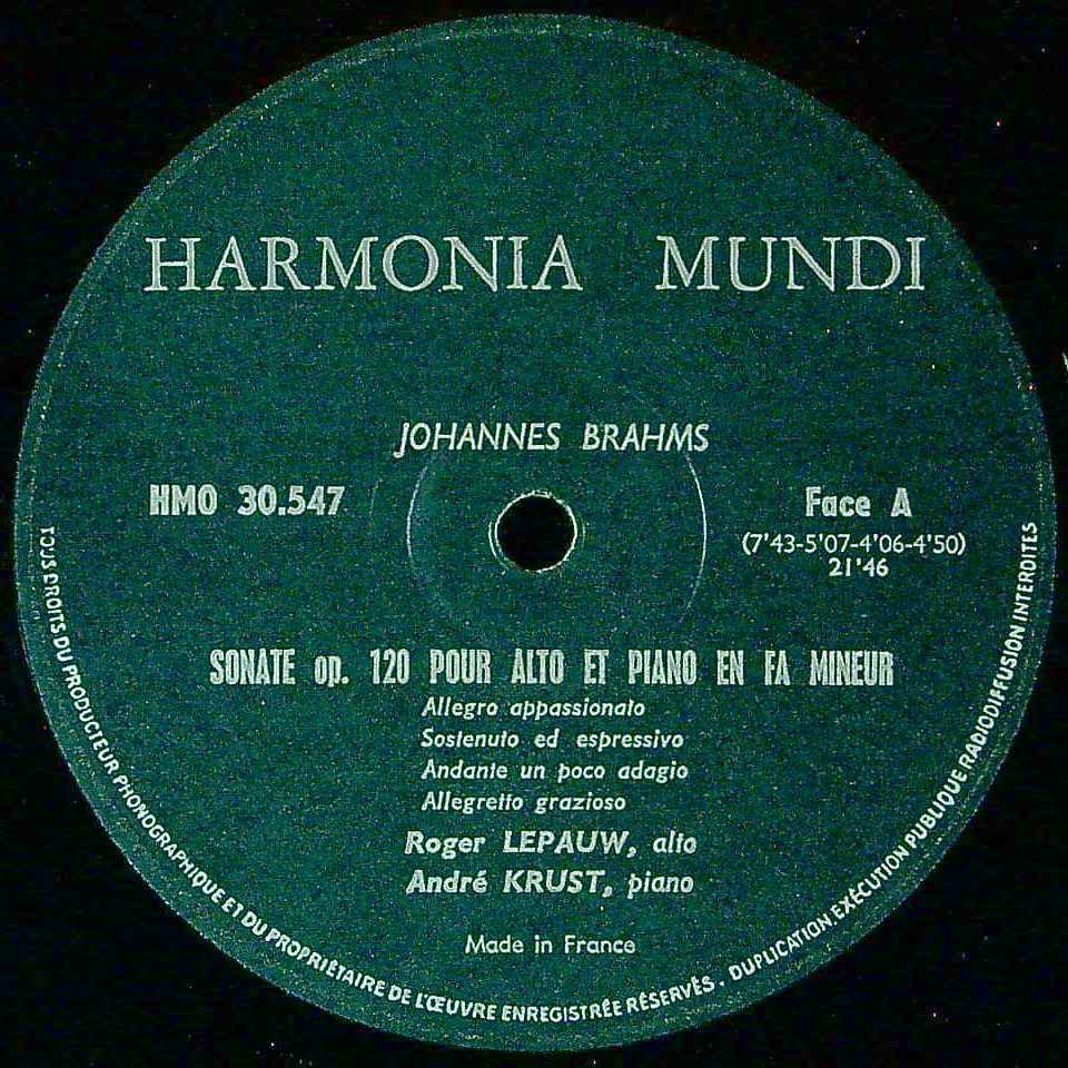 商品詳細:非常に珍しいHarmonia Mundiのオリジナル録音。1964年頃モノラル/ステレオでリリースされた。ドイツ側でもリリースされたと思われが間違いなくフランス録音と思われる。ヴィオラ奏者ロジェ・ルポーは生れ年不明のヴィオラ奏者。世にヴァイオのソリストだけで活動できるヴァイオ奏者はいない。それだけヴィオラがソロをとれる曲がないからである。ルポーはこれまでのチッコリーニとモーツァルトのK.498で共演しており、パリ管弦楽団弦楽四重奏団(Quatuor À Cordes De L'Orchestre De Paris)のメンバーとして共演している。クラリネットのアンリ・ドリュアールとK.581やブラームスのクラリネット五重奏曲Op.115等の録音もあった。またそれ以前にLe Quatuor N.D.M.という聴いた事のない弦楽四重奏団にも所属していた。この団体は幸松肇 氏の「世界の弦楽四重奏団とそのレコード」にも掲載されていないマイナーな団体でN.D.M.の意味は不明だがメンバーは解かっている。 Michel Ganot,/Robert Gendre/Roger Lepauw/Robert Bexの4人。チェロのRobert Bexは良く知られたソリストで多くの録音を出している。元々パリ国立歌劇場o.の首席チェロ奏者であった。N.D.M.弦楽四重奏団の詳細は全く不明。その団体のヴィオラ奏者であるロジェ・ルポーがソリストとしてブラームスのVaソナタを録音という快挙である。しかし母体であるN.D.M.弦楽四重奏団やパリ管弦楽団弦楽四重奏団があまり知られていないのは釈然としない。ブラーム晩年の傑作として、クラリネットでの演奏も多い、2つのソナタ。聴いてみると、ルポーのソロはまるでヴァイオリン奏者のように実に明快に旋律を刻むはっきりとした豊かな音を出している。所謂前に出る音である。ヴァイオリンより旋律を奏でることが不利になるヴィオラだが、ここまでくっきりとした音で演奏されたヴィオラ・ソナタは思い浮かばない。重音奏法も取り入れ、なかなか聴かせる演奏である。クラリネット演奏も良いが、ヴィオラ版ならばこの録音は是非お勧めしたい。1960年代中期以前の良い時期であり、音も腰の座った低い音が出ている。