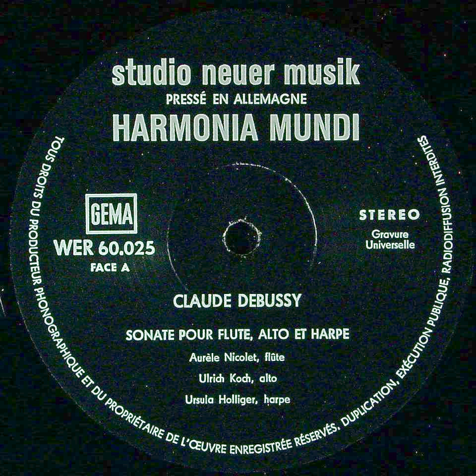 商品詳細:仏Harmonia Mundiの灰系木目デザイン・ジャケットに入る室内楽シリーズの一つ。ラヴェルとバルトークはC.ボナルディ(vn)を中心としたメンバーであったが、ドビュッシーはHarmonia Mundi録音ではなく、ドイツの近現代作品専門のレーベルWERGO音源のライセンス製造と思われる。その為レコード番号はHMO ---ではなく、ドイツ・WERGOが使うWER---で始まる番号が付く。但し、レーベル名としてはHarmonia Mundiが印刷される。マスターはWERGOのものがそのまま使われ、ドイツSonopress工場でフランス向け仕様にOEM製造されたレーベルがフランスで製造されたHarmonia Mundiのジャケットに入る形でフランスでリリースされた。従ってメンバーはHarmonia Mundiとは関係のない、A.ニコレ(fl)、U.ホリガー(H.ホリガーの妻)(hp)、S.パルム(vc)らWERGOのメンバーである。WERGOでは1967年に同一番号でリリースされた。フランスでも同年発売と思われる。ドビュッシーの室内楽作品は意外にも纏まって録音されることは多くない。曲ごとに使用楽器が異なるため、多くの音楽が必要になるからである。しかもせっかく招聘しても、ピアノ以外は1曲しか出番がないのである。その為、どれか1曲が同じ楽器構成の別の作曲家の作品とカップリングになるLPが多い。WERGOは近現代作品専門のレーベルであり、3曲の録音の為に六人の器楽奏者を招聘した。演奏は1960年代中期とあって落ち着いた表情の吟味されたものであり、器楽奏者たちの妙技が愉しめる。ドビュッシーはその晩年、「様々な楽器のための6つのソナタ (six sonates pour divers instruments)」を作曲する計画を立てた。1915~1917年の2年間に、癌に侵されながらもVcソナタ ニ短調、Fl・Va・Hpのソナタ 変ロ長調、 Vnソナタ ト短調の順に3曲を書き上げたが、残り3曲は1918年に没したため未完に終わった。残り3曲とはオーボエ・ホルンとクラヴサンのためのソナタ、トランペット・クラリネット・バスーンとピアノのためのソナタ、コントラバスと各種楽器のためのコンセール形式のソナタである。当LPはこの実現された3曲を収録したLPである。3曲ともドビュッシーが作曲した室内楽曲の傑作と評価されている。中でもフルート・ヴィオラとハープのためのソナタ はLP片面を要する曲で静寂性の中にフルート、ハープという透明感のある楽器の美しさを際立たせた傑作である。ニコレは3回の録音があり、これが初回録音である。ハープにはオーボエ奏者のハンツ・ホリガーの妻であるウルズラ・ホリガーが参加。スイス人同士の共演でニコレとの相性がぴったりといえる。