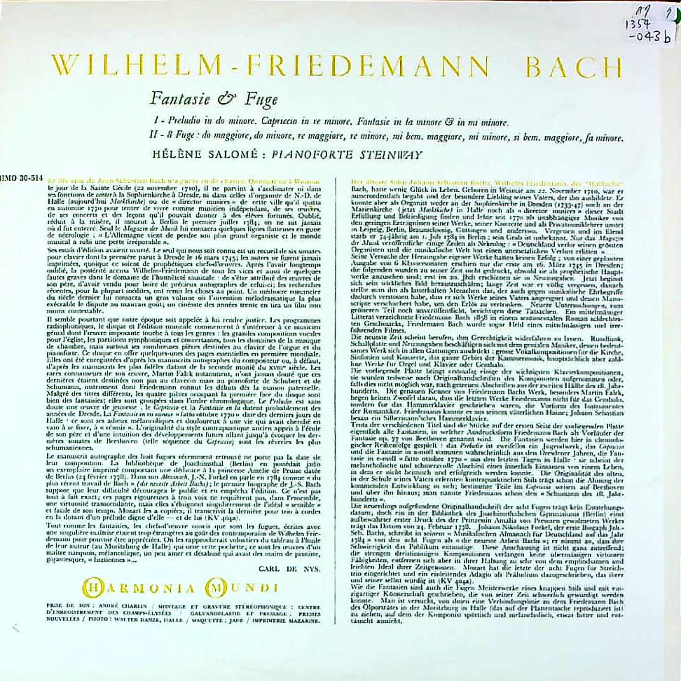 商品コード:1354-043b[HM] H.サロメ(pf) / W.F.バッハ:Pf作品集/前奏曲F.19, カプリッチョF.29 他