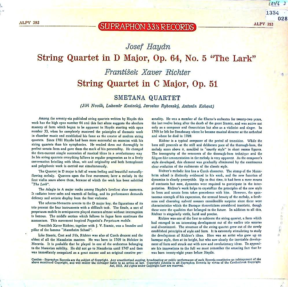商品コード:1354-028p[SUPRAPHON] スメタナQt./ ハイドン:弦楽四重奏曲第67番 「ひばり」, F.X.リヒター:弦楽四重奏曲