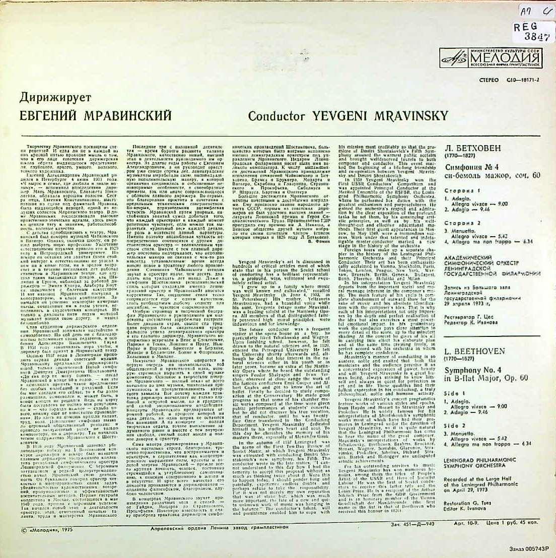商品コード:REG-3847[露MELODIYA] E.ムラヴィンスキー/ ベートーヴェン:交響曲4番