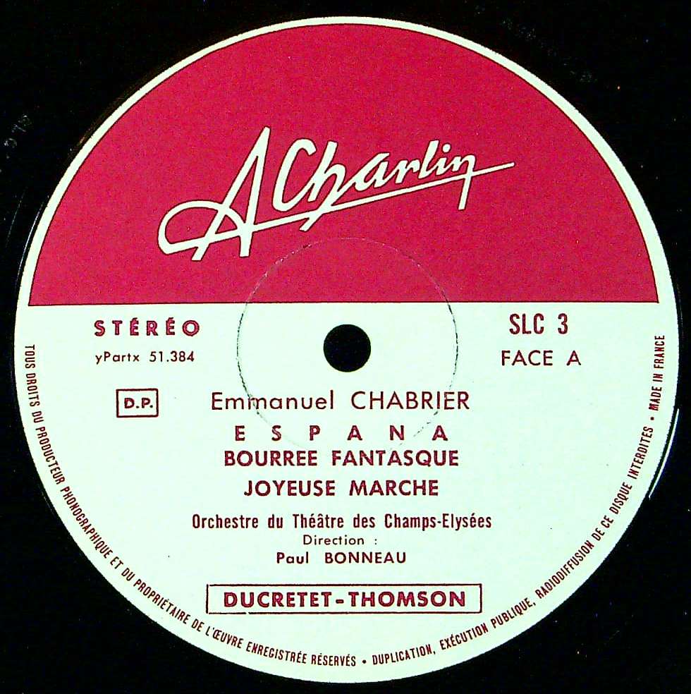 商品詳細:どうもオリジナルはDucretet Thomsonのようだが、モノラルのみDucretet Thomsonで発売され、ステレオマスターを持っていたアンドレ・シャルランがステレオ期になって自社レーベルからステレオを発売したパターンであると思われる。実際Ducretet Thomsonの録音を請け負っていたシャルランだからこそできた芸当であり、そのような未発売音源を持っていたから自社レーベルを立ち上げげることができたともいえる。古い音源だとしてもシャルランが手掛けた録音なら音質が良いのは周知の事実。いかにもフランス的な優美ですっきりしたステレオに仕上がっている。シャブリエの代表的な管弦楽曲7曲入り。内、数曲はピアノ曲からの編曲。フランスに生まれ、政府の役人をしながら多くの作品を残した。ダンディ、フォーレ達と親交があり、特にピアノ曲はメイエル等のLPで有名。高音質でフランス近代の音楽が楽しめる逸品。当初Ducretet Thomsonから10"・255C 106で発売、1960年頃にClub National de Disques:CND 1513でサードパーティプレスとして会員頒布システムでクラヴ盤としてリリース。1962年頃、当Disques A Charlin:SLC 3という番号でステレオ・リリースしている。一方PathéからDTX 30275という番号で10"より2曲ほど多いプレスがL.フレスティエ指揮コンセール・コロンヌo.と分け合って1960年代初め頃リリースされている。PathéではP.ボノー指揮シャンゼリゼ劇場o.が録音した曲をL.フレスティエ指揮としてクレジットしている曲がある(ブーレ・ファンタスク、狂詩曲スペイン)。指揮者ポール・ボノーはフランスの作曲家。---Wikipedia--モレ・シュル・ロワン出身。パリ音楽院に入学し、和声をジャン・ギャロンに、フーガをノエル・ギャロンに、作曲をアンリ・ビュッセルに師事した。1939年に陸軍に入り、1945年に軍楽隊長に就任した。しかしラジオ・フランスの軽音楽部門の指揮者の仕事に専念するため退役した。ラジオ・フランスでは1944年から30年間で638曲を指揮した。また1959年に「レ・ジーン・シンガーズ」という合唱団を創設し、指導にあたった。作品には『サクソフォーン協奏曲』『ニューヨークのフランス人』などの管弦楽曲の他、11のバレエ音楽、51の映画音楽などがある。---Wikipedia-- シャブリエなどのフランス作品を得意とする。B面:田園組曲の第1曲目、牧歌・Danse villageoiseはピアノ作品「10の絵画的小品」~6番「牧歌」をシャブリエ自ら管弦楽編曲したものである。これら生粋なフランス作品はポール・ボノーのような生粋なフランス人指揮者によって更に輝きを増すのである。狂詩曲『スペイン』もまた代表作である。シャブリエが持つ異国情緒を端的に表すことができた指揮者の一人で、優美に整えるなどの手を加えず、ありのままのストレートな表現に我々はシャブリエの本質を感じることができる。ステレオによりDucretet Thomsonとは全く異なる印象になるから不思議!スーパーオーディオファイルLPに仕上がっている!