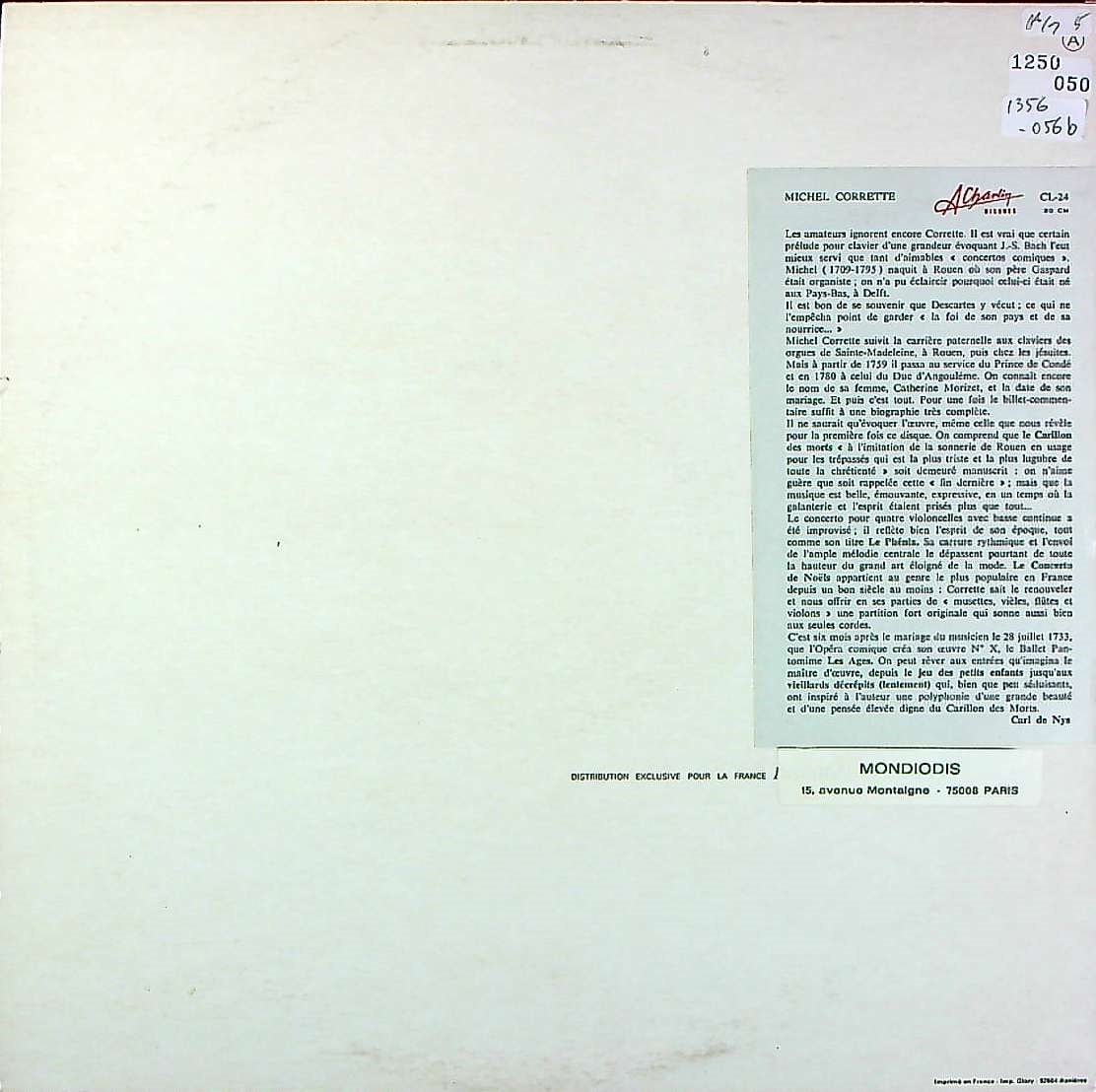 商品詳細:ミシェル・コレット( 1707- 1795)はフランス・ノルマンディーのルーアンに生まれた。父親のガスパール・コレットはオルガニストで作曲家だった。1737年頃から1780年まで、パリのイエズス会の大学でオルガニストを勤めた。1773年以前にイングランドに旅したことも知られている。1780年、アングレーム公爵にオルガニストとして仕え、15年後、87歳でパリで亡くなった。舞台のためのバレエ音楽とディヴェルティメントの中には、『Arlequin(アルルカン)』『Armide(アルミード)』『le Jugement de Midas(ミダスの審判)』『les Âges(時代)』『Nina(ニナ)』『Persée(ペルセウス)』といったものがあり代表的な作品である。多くの協奏曲を作った。シャルランが残した仕事の中でもマイナーなフランス作品に分類される。フランスの天才的エンジニア、アンドレ・シャルラン(1903-1983)。17歳頃から自身でアンプなども組み立て200以上の特許を取ってる。1930年代に入ると映画の音響技師として活躍、映画のカラー映像方式に関しても特許を取っている。また、第二次世界大戦中には、灯火管制中の暗闇で走る事を余儀なくされていた自転車用として、ダイナモも新開発した。1949年に映画関係事業をオランダのPHILIPSへ売却したシャルランが始めたのが音楽録音業である。シャルランの持つ特許を可能な限り駆使してLPを生産しようという、デュクレテ・トムソンを始めとする幾つかのレーベルの思惑もあったらしい。録音技師としてデュクレテ・トムソン、DFやVSMなどで名を上げた後の1962年には「シャンゼリゼ録音センター」を設立、自らのレーベル Edition André Charlin も立ち上げた。残念ながらこの事業は1970年代中頃までしか続かず、税金の滞納でマスター・テープなどを差し押さえられてしまったと伝えられる。シャルランは1983年に80歳で亡くなってしまったが、版権はそのまま死去の直前に取り戻すことができ、今ではCDに焼き直されて世界で販売されている。高音質で知られたEdition André CharlinのCDは1枚あたり\11000という価格が付いている。果たして再版の極致であるCDにそれだけの価値があるのか疑問だがLPの価値は永遠だろう。ワンポイント録音は言葉では知っていても実際にLPで聴けばどういうものかすぐに体感できる。空間に包まれるような自然な音が何の抵抗感もなくすんなりと耳に取り込まれる。この感覚は聴いた人にしかわからないだろう。初期のシャルラン本人の録音と後の後輩技師たちによる録音は全く同じではないがワンポイント技法は同じである。この録音は彼が設立した「シャンゼリゼ録音センター」にてアンドレ・シャルランによる録音であると思われる。クリアーだがしっかりとした立体感があり、本当の意味で音楽的でありながら素晴らしい音質である。各楽器のリアルな響きが印象的で目の前で聴いてるような錯覚になる。フレンチバロックの神髄!