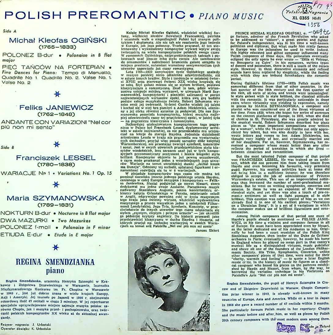 商品詳細:ショパン全集でお馴染みのスメンジャンカ女史による「ロマン派以前のポーランド・ピアノ音楽」とタイトルの付いたモノラル/ステレオ録音。音質は大変良い。1970年代前半だろう。1700年代中期に生まれた作曲家4人の8作品を収録。ショパンが生まれる土台となった歴史を見ることができる。彼女は1949年、ショパン・コンクールの優勝者で、その実力は折り紙付。快活で明るいOGINSKIやモーツァルト的なJANIEWICZ、ショパンを感じさせるSZYMANOWSKA等、楽しめる名ピアノ曲集! レギナ・スメンジャンカ(1924 - 2011)は1924年地元出身、1949年第4回ショパン・コンクールで11位だった。優勝はチェルニー・ステファンスカ。1950年から1955年にズビグニェフ・ジェヴィエツキの弟子となり、続いて国際的な経歴を打ち立てた。スメンジャンカはショパン音楽アカデミーの教授を1996年まで務め、短い間ではあるが学長を務めた。1970年、1980年、1995年、2000年のショパン・コンクールの審査員を務めた。「ショパン大全集」にも参加して協奏曲他数点のLPを担当した。ポーランド・ピアノ界ではチェルニー・ステファンスカに次ぐ国際的名声を持つ女性ピアニスト。明るく可憐な女性らしい美しい演奏。選曲もよくMUZAでしか出来ないロマン派以前のポーランドPf作品集である。LPとしての完成度も高い!