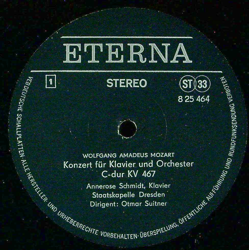商品詳細:A.シュミットは'70年代に入ってマズアとの全曲録音を果たしたが、この2曲はそれ以前にスウィトナーと入れた全て。15番のみ10"のモノラルが初出。ETERNAはモノラルが出たあと10年程経って初めてステレオが出るケースが多く、擬似ステレオではない(ステレオプレスの技術が西側より約10年遅れた為)。正直言って、シュミットのソロは2回目より抜群に良い。それぞれ、シュトリューベン、ルンゲの録音。みずみずしく、美しい理想的なモーツァルト!! 825 464はV字ステレオが同一番号で存在するが滅多にない高額盤で黒厚盤なら十分満足いただける音質である!但しモノラル820 464は別格!アンネローゼ・シュミット(1936-2022)はアンネローゼ・ベック で、ドイツ、ルターシュタット・ヴィッテンベルク出身の美形の女性ピアニスト。父がヴィッテンベルク音楽院の院長であった為、英才教育を受け、幼少時の1945年9歳で正式にデビューした。1955年ライプツィヒ音楽院を卒業。1956年の国際ロベルト・シューマン・コンクールで優勝した。その為ETERNAのシューマンEDにも参加している。1987年ハンス・アイスラー音楽大学ベルリン教授及びピアノ学科学部長に就任。1990年にはそのまま学長となった。2000年からはショパン国際ピアノ・コンクール評議員を務めた。2006年にコンサート・ピアニストを引退。2022年に亡くなった。日本へは1973年から数回訪れている。1977年の来日では東京文化会館でブラームスのピアノ協奏曲第2番をグシュルヴァウアー指揮/読売日本交響楽団と披露した。当初よりモーツァルト弾きとしてモノラルでソナタ録音などもあったが、ETERNAに一人で複数台Pf用とチェンバロなどで演奏される初期番号は除く、5番以降の17曲の協奏曲とロンド2曲をクルト・マズアと共に録音したことは永久に記憶されるであろう。しかしその前に1963年スウィトナーと入れた2曲を超えることはできなかった。それでも東独に17のモーツァルト協奏曲を残した実績は大きいと言わざるを得ない。彼女の音は清潔且つ端正。情感タップリではなく楽譜に奉仕するタイプである。自分を出さず曲に寄り添う。従ってフランス系の1950-60年代に活躍したスタイルと比べると物足りなさが残る。しかし少し物足りないくらいが繰り返し聴くには必要な条件である。コンヴィチュニーのベートーヴェンと同様ETERNAにある美学だろう。これは、マズアとの全集録音よりも前の1964年初リリースのスウィトナーとの単独録音。
