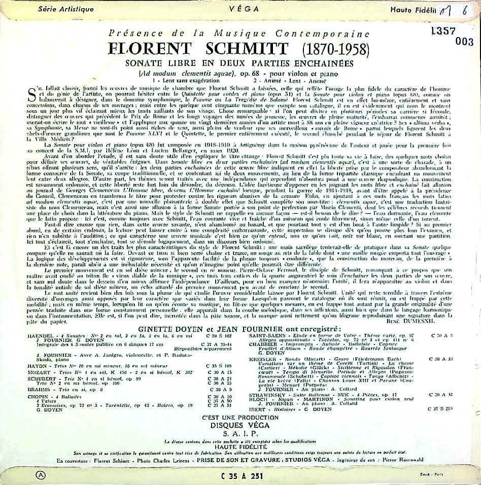 商品コード:1357-003[VÉGA] J.フルニエ(vn)/ シュミット:2つの声部の結びあった自由なソナタ(Vnソナタ)