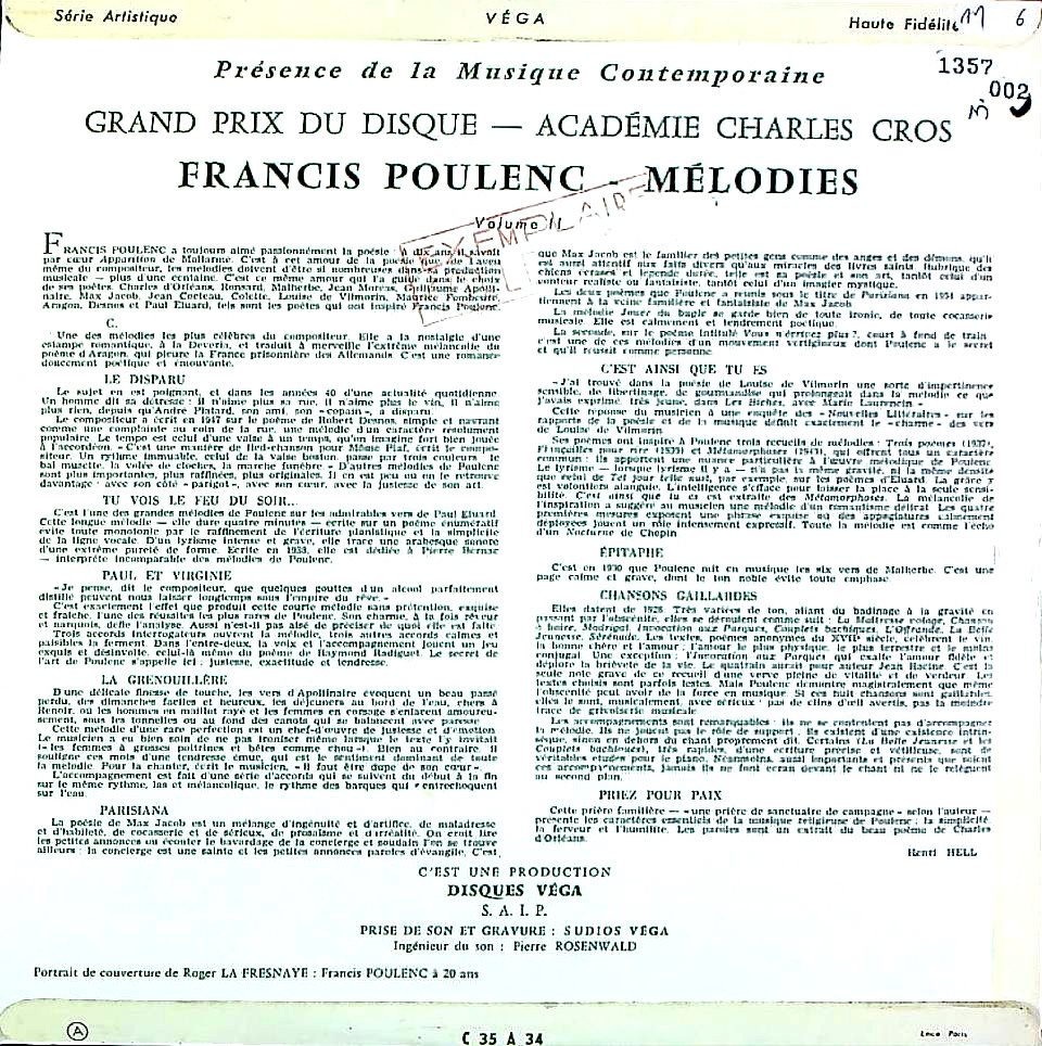 商品コード:1357-002[VÉGA] P.ベルナック(br) / プーランク:歌曲集-2