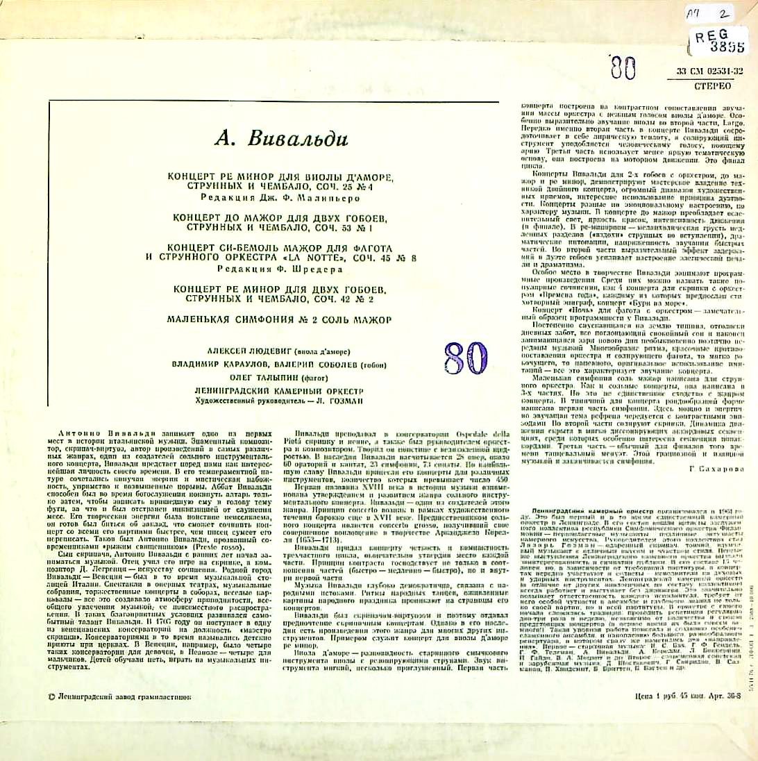 演奏者:V.カラウロフ, V.ソボレフ(ob), A.ルデヴィヒ(va)O.タルイピン(fg)L.ゴスマン指揮レニングラード室内o.