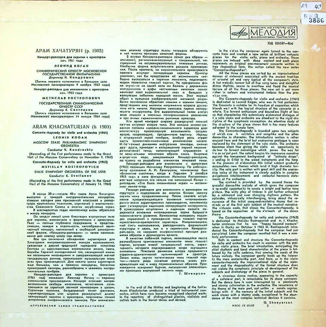商品コード:REG-3886[露MELODIYA] L.コーガン(vn) /M.ロストロポーヴィチ(vc)/ ハチャトゥリアン:Vnのためのコンチェルト・ラプソディ, Vcのためのコンチェルト・ラプソディ
