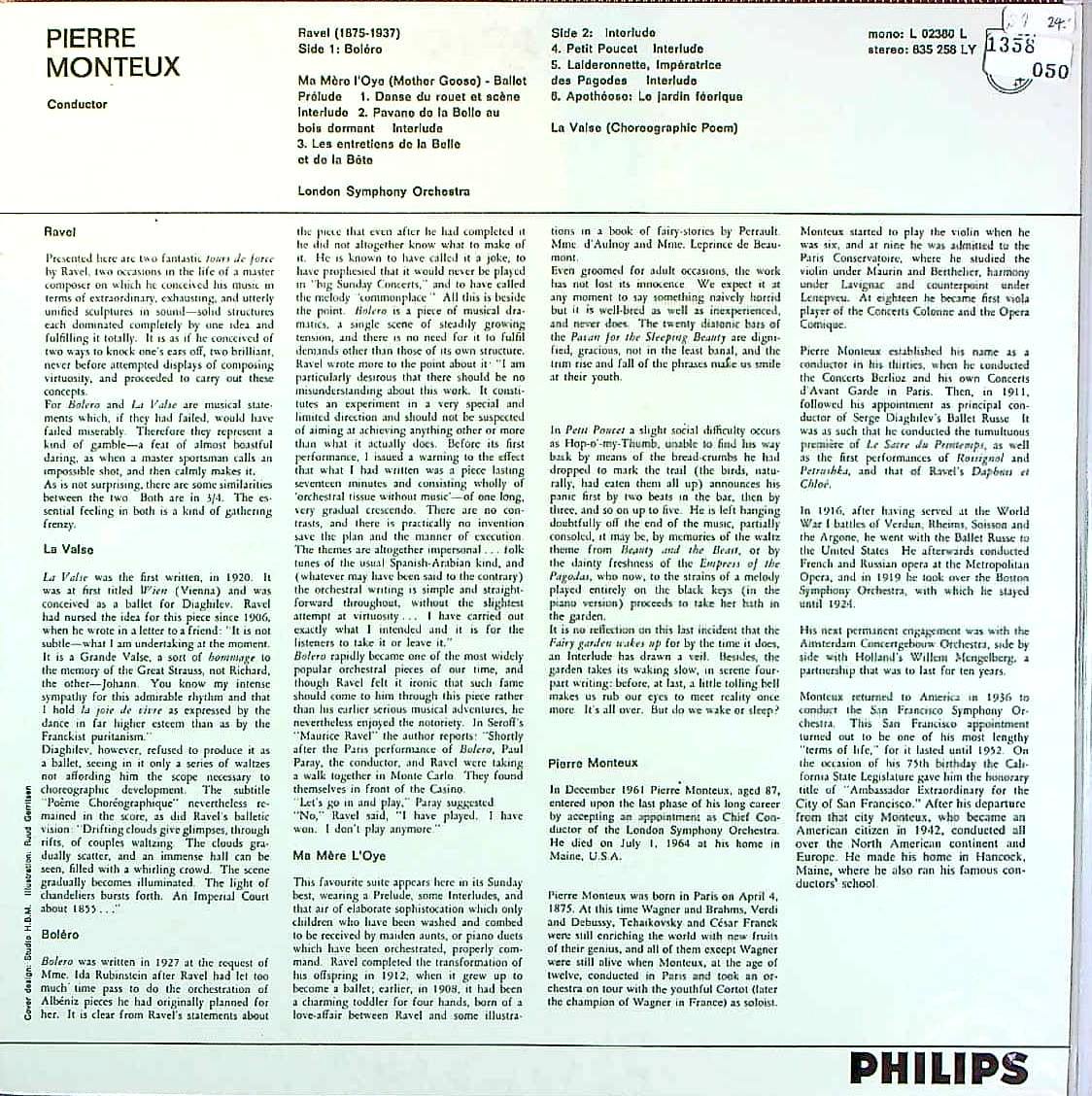 商品コード:1358-050[PHILIPS] P.モントゥー/ ラヴェル:ボレロ, バレエ音楽「マ・メール・ロワ」(全曲), ラ・ヴァルス