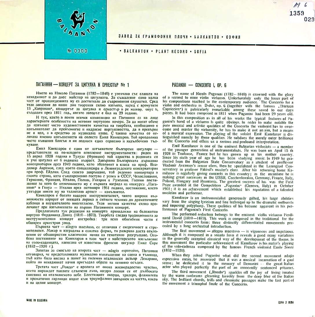 商品コード:1359-029[BALKANTON] E.カミラロフ(vn)/ パガニーニ:Vn協奏曲1番