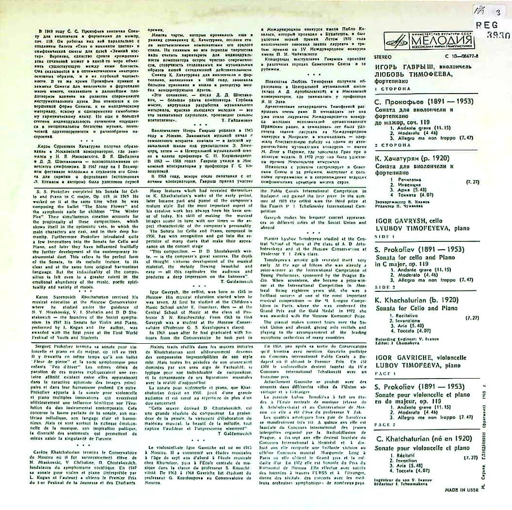 商品コード:REG-3930[露MELODIYA] I.ガヴリュシュ(vc)/ プロコフィエフ:Vcソナタ9, ハチャトゥリアン:Vcソナタ