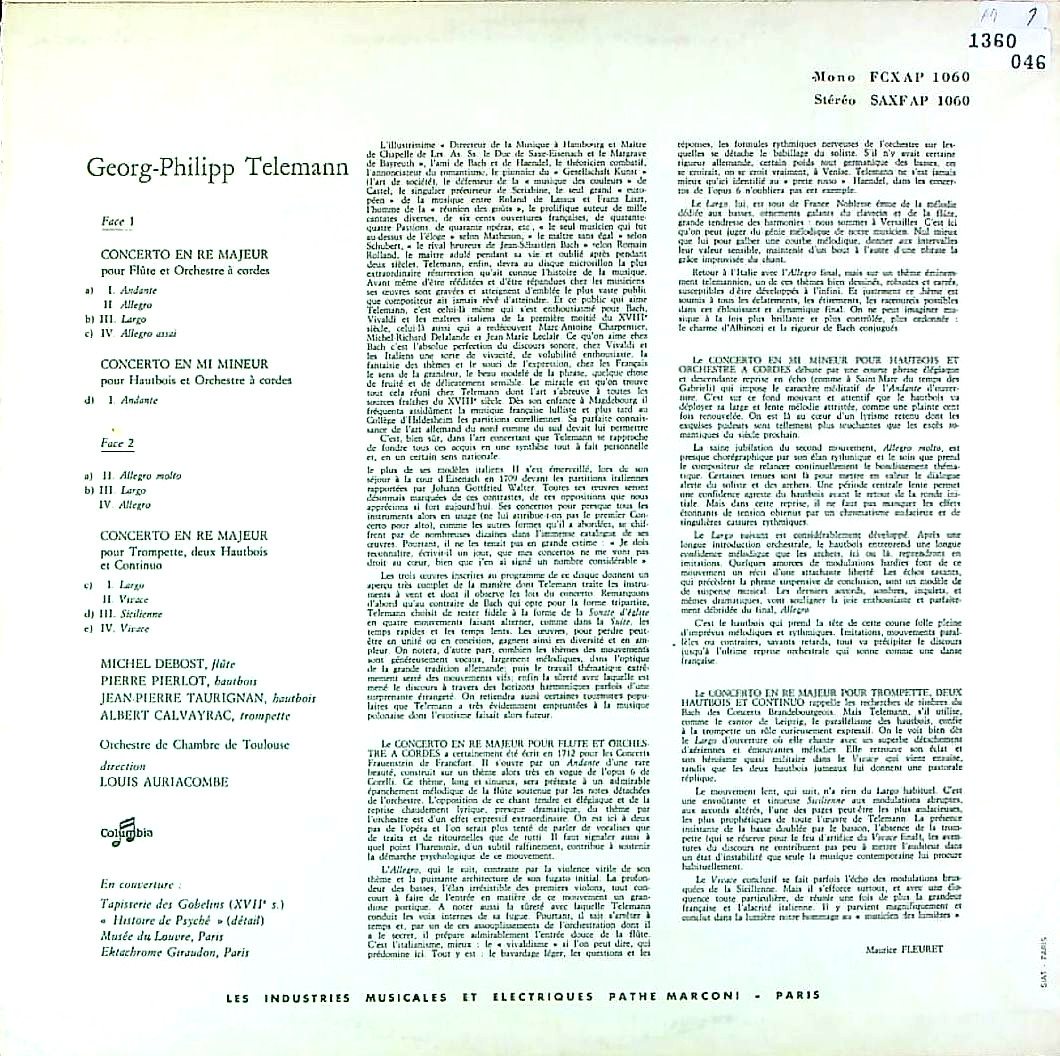 商品コード:1360-046[COLUMBIA] L.オーリアコンブ指揮 M.デュボースト(fl) 他/ テレマン:Fl協奏曲, Ob協奏曲 他