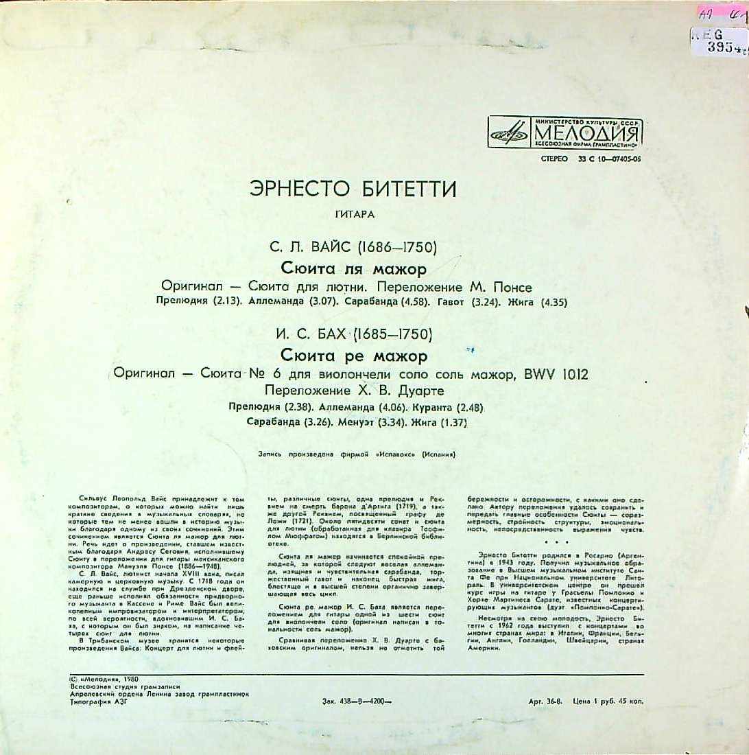 商品コード:REG-3954t[露MELODIYA] E.ビテッティ(gt) / ヴァイス:組曲イ長調, バッハ:無伴奏Vc組曲6番B.1012(Gt版)