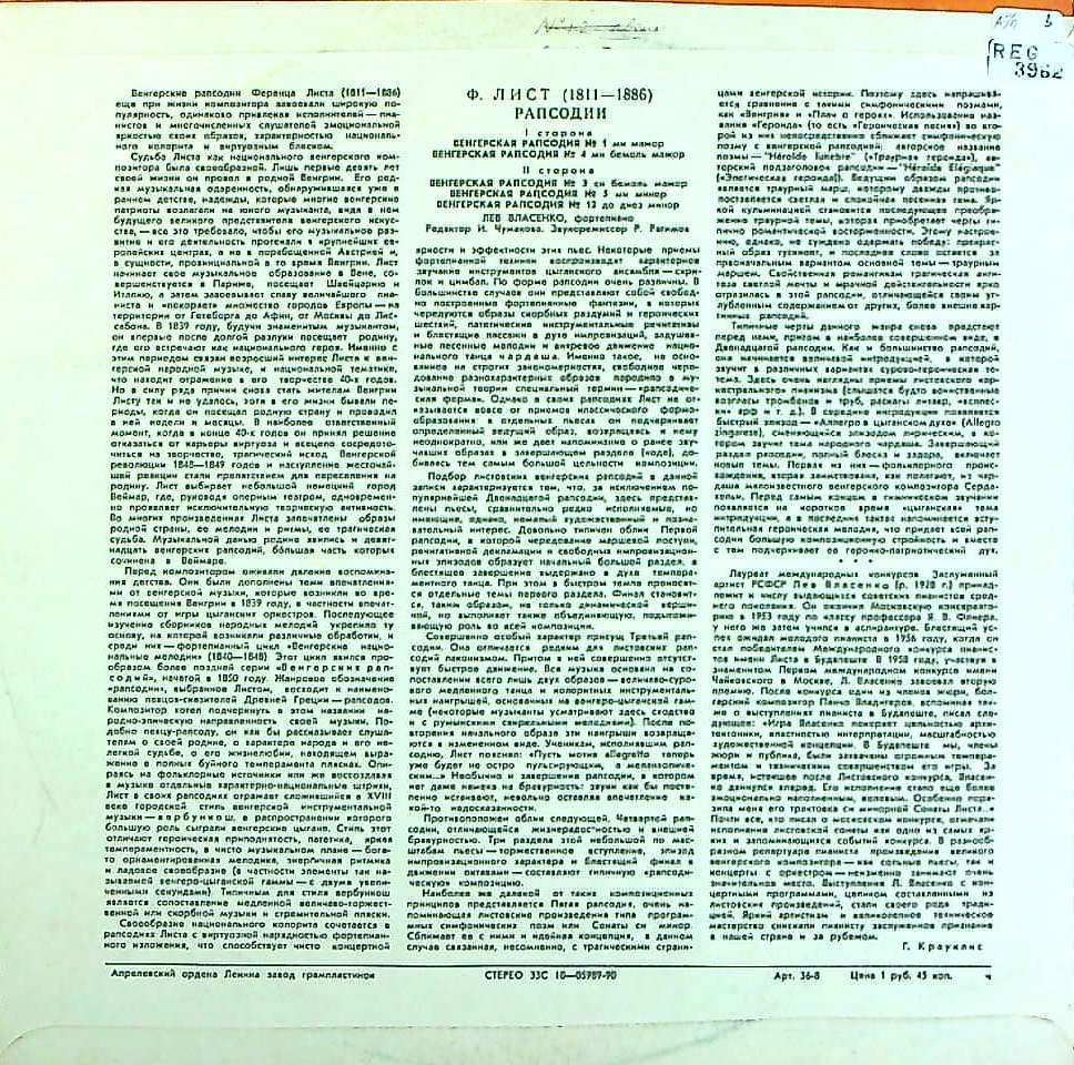 商品コード:REG-3962[露MELODIYA] L.ヴラセンコ(pf) / リスト:ハンガリー狂詩曲1, 3, 4, 5, 12番