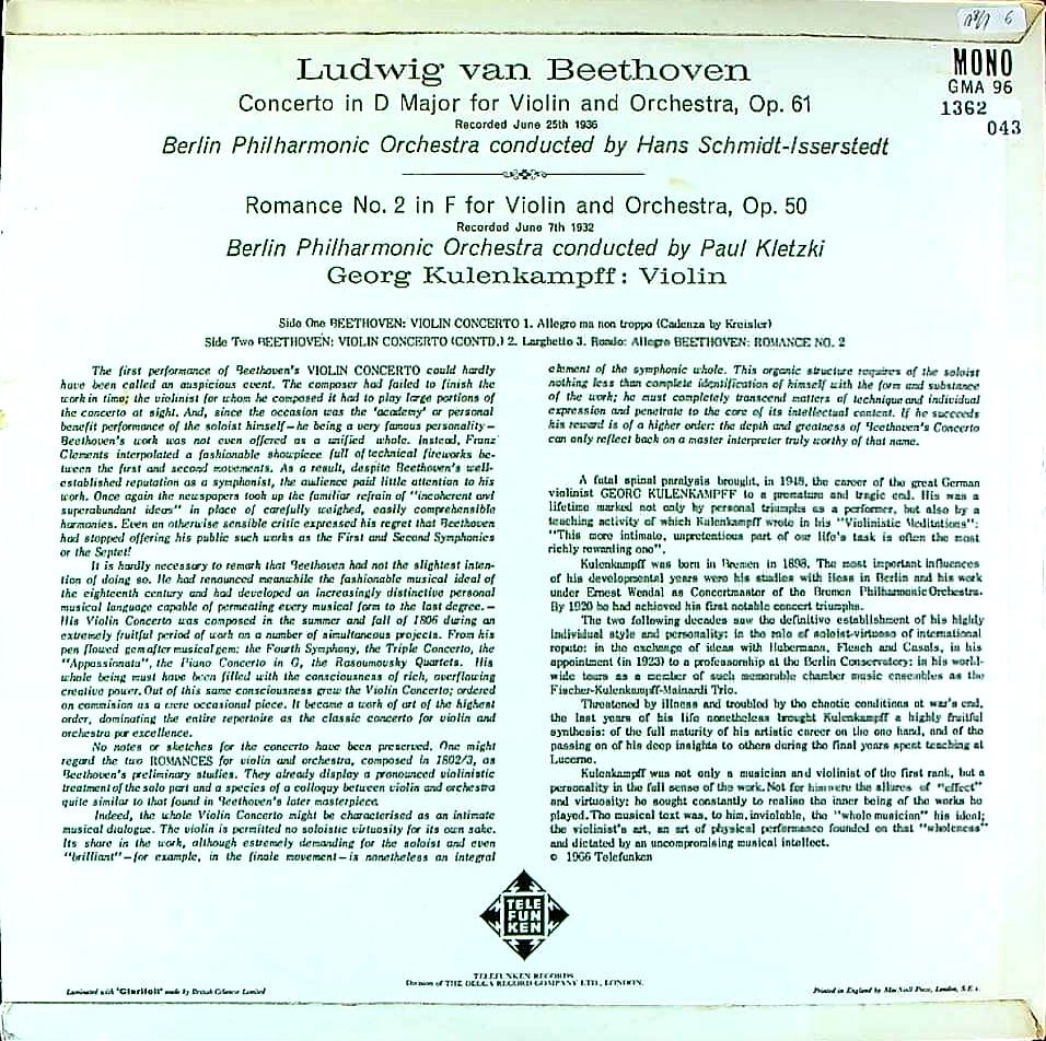 商品コード:1362-043[TELEFUNKEN] G.クーレンカンプ(vn)/ ベートーヴェン:Vn協奏曲, ロマンス2番