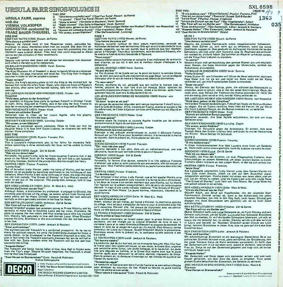 商品詳細:当社初入荷の希少な番号。ソプラノ歌手、ウルズラ・ファルに関する情報は全くなく、ジャケットにも一切記載がない。曲の内容から見てドイツ語圏生まれの歌手ではないかと想像できる。1972年にオペラ・アリア集-1:SXL 6537(未入荷)と1973年頃にオペラ・アリア集-2:SXL 6598(当アイテム)の2枚が発売されただけと思われる。今回Vol.2が初入荷となり、時間を掛けて調べたが、全く情報はなかった。声質は意外なほど軽く、澄んだ美しい声で、歌曲、宗教曲にも十分対応できそうなリリック・ソプラノ。2枚のLPを録音して突然消えてしまったソプラノ歌手。クルト・ゲーベル 指揮ベルリン・スタジオ管弦楽団によるデリンガー:歌劇「ドン・セザール」に参加しており、ベルリン・ドイツ・オーパーに籍を置く歌手かもしれない。声質も良く実力がある歌手ながら、短期間に2枚だけ残して録音市場から消えた珍しい歌手である。実演ではその後も活動したと思われるが、録音がされないのは何らかの事情があったのだろう。ソプラノ歌手好きにはかなりの珍品である。声も良く、曲数も多い珍しいオペラ・アリア集!