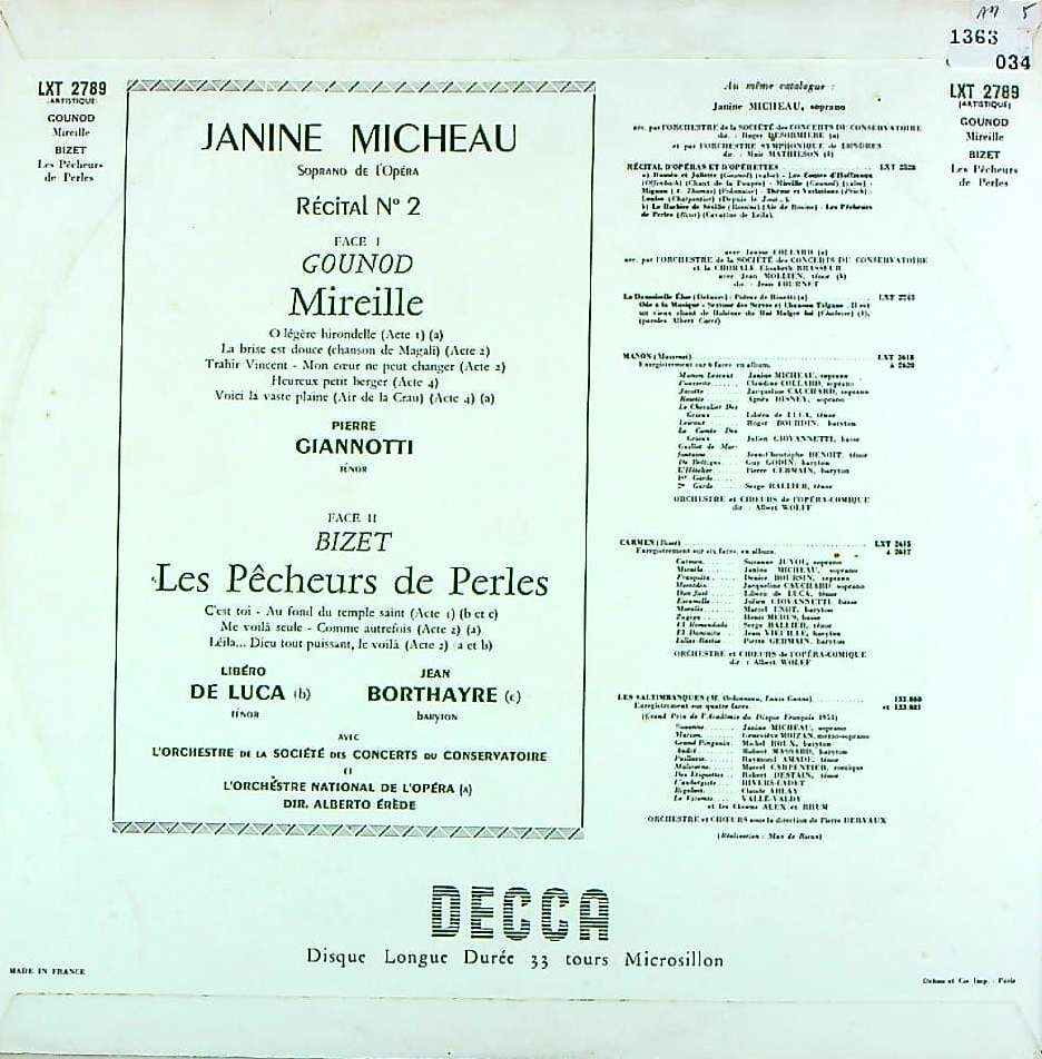 商品コード:1363-034[DECCA] J.ミショー(s)/ 「レシタル-2」オペラ・アリア集/ビゼー:真珠採り~3曲, グノー:ミレイユ~5曲
