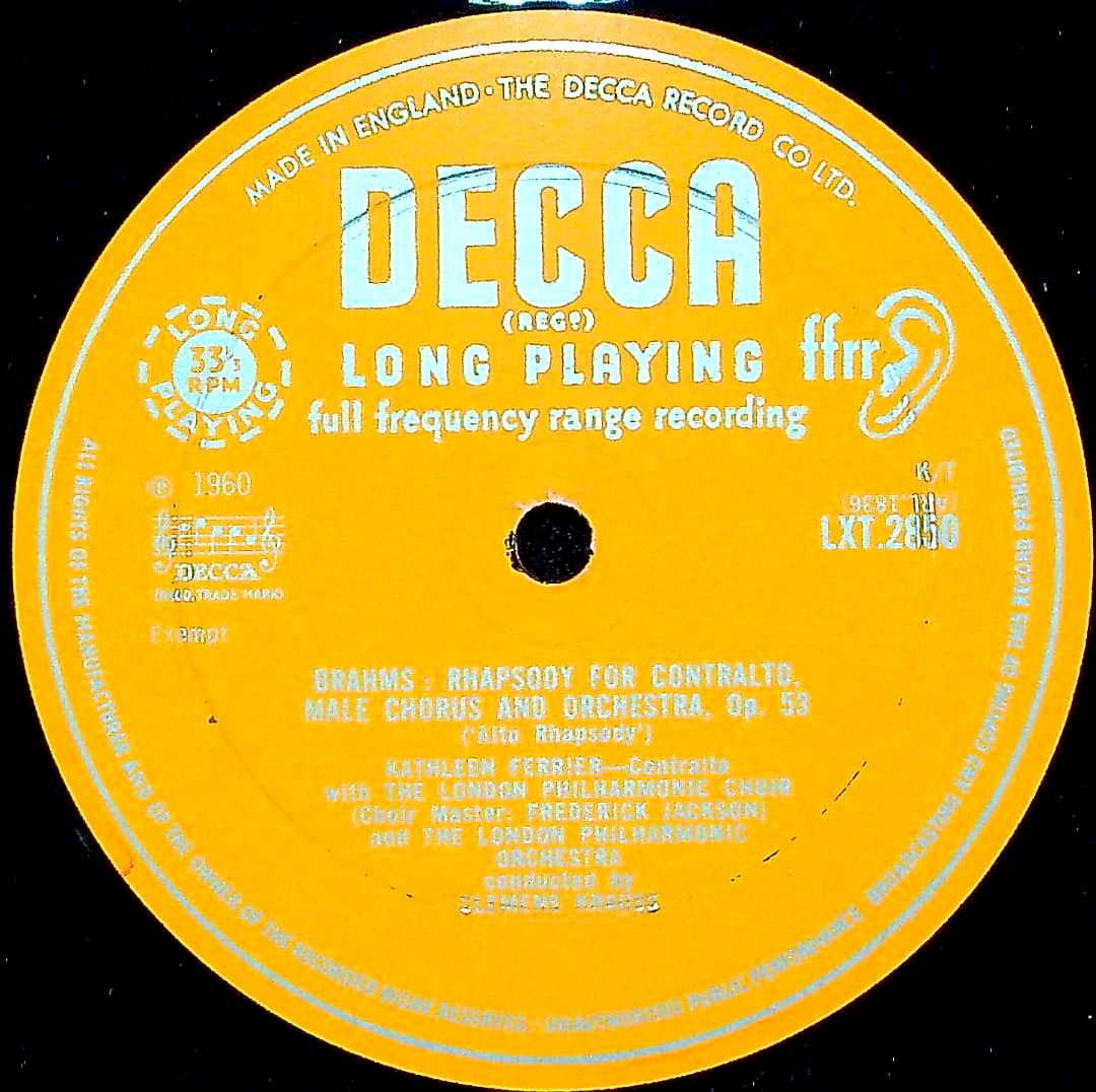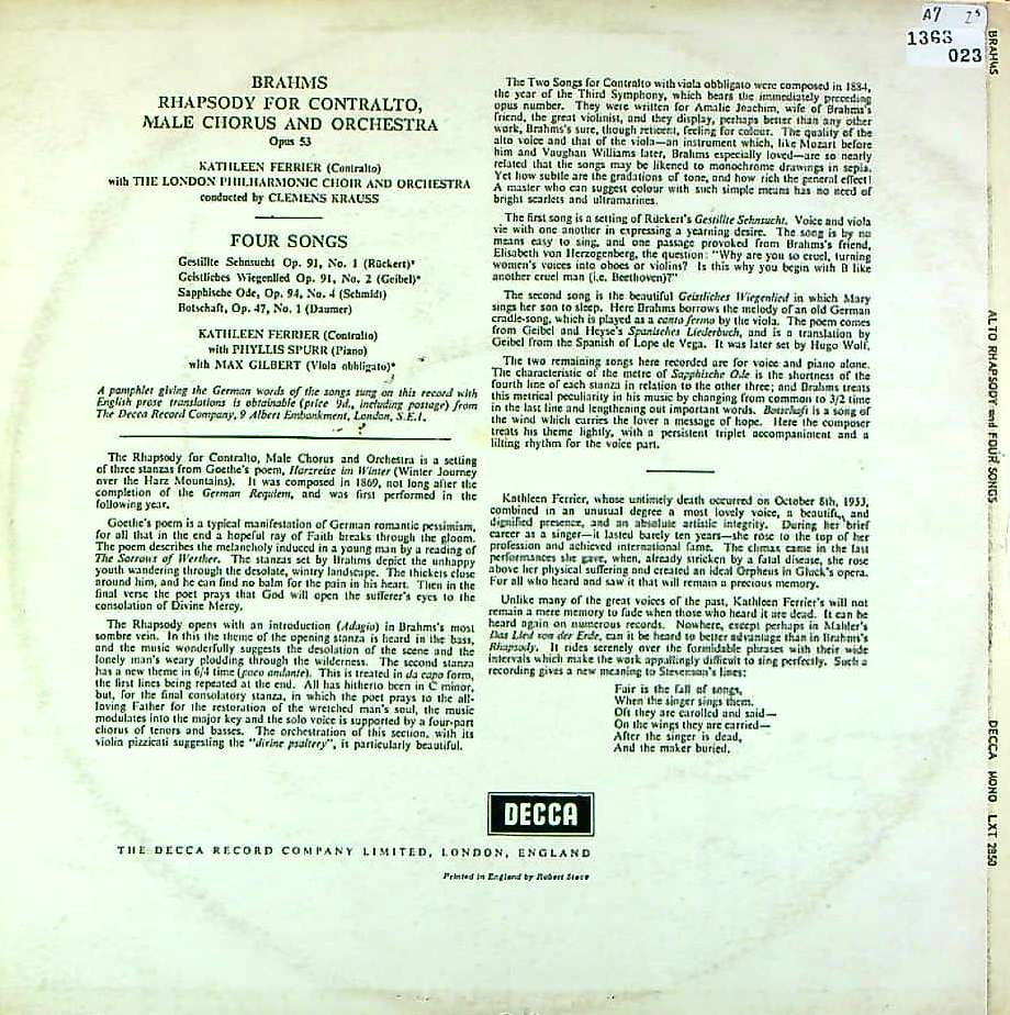 商品コード:1363-023[DECCA] K.フェリアー(ca)/ ブラームス:アルト・ラプソディ, 4つの歌曲