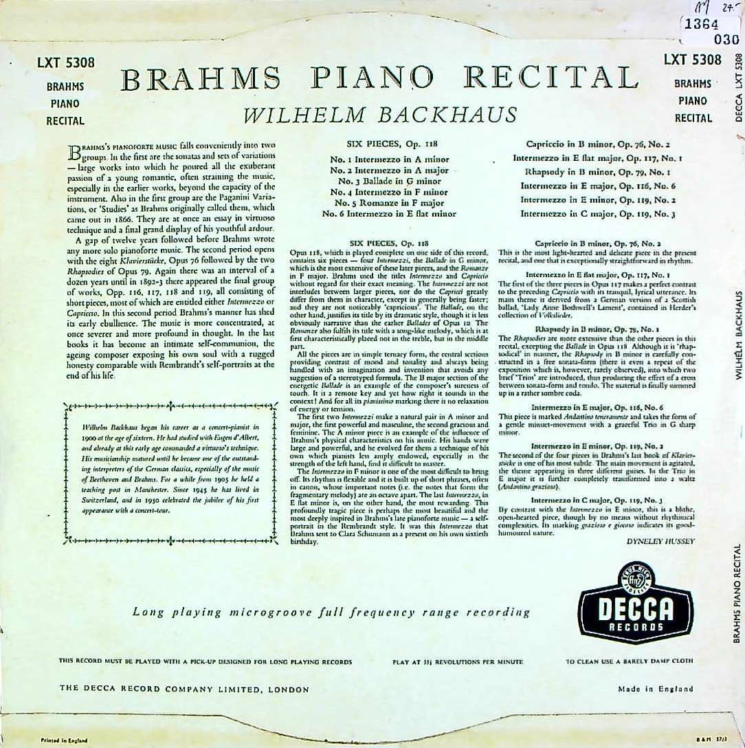 商品コード:1364-030[DECCA] W.バックハウス(pf) / 「ブラームス:Pf作品集」6つの小品 他