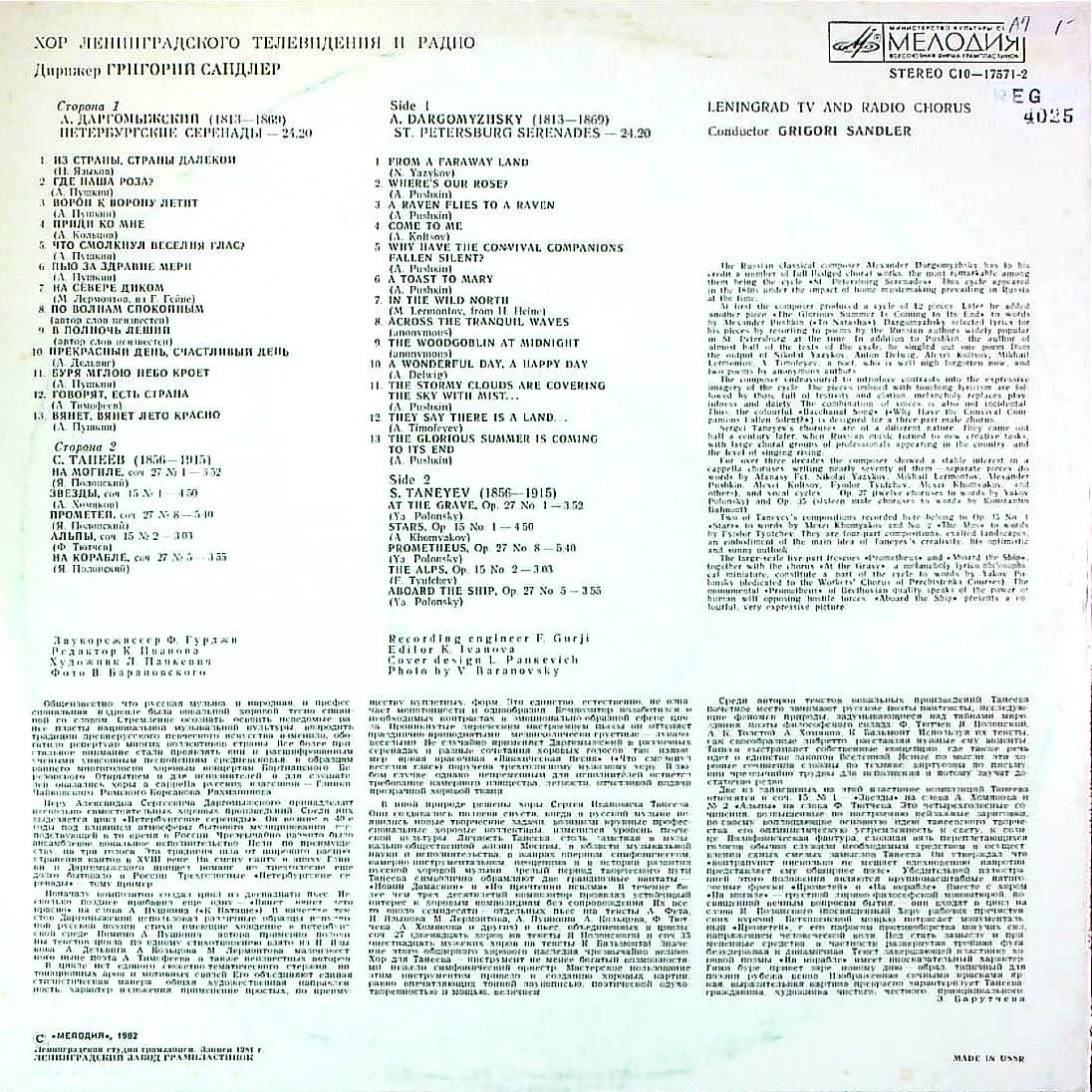 商品コード:REG-4025[露MELODIYA] G.サンドラー/ ダルゴムイシスキー:「ペテルブルクのセレナーデ」(全曲), タニェエフ:混声合唱のための12の合唱曲~1, 8, 5(3曲) 他