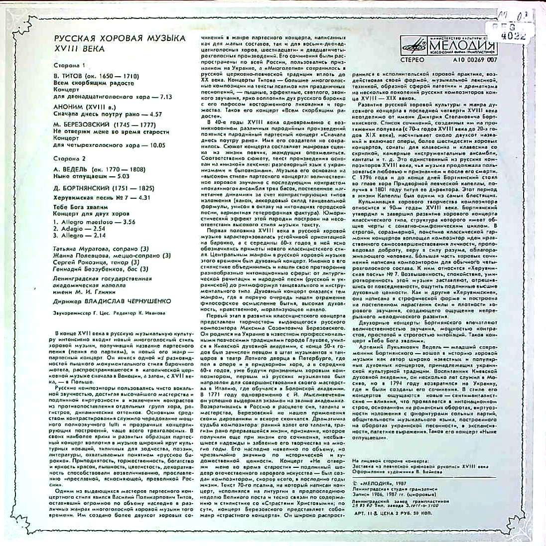 商品コード:REG-4022[露MELODIYA] V.チェルヌシェンコ/ 「18世紀ロシアの合唱曲」
