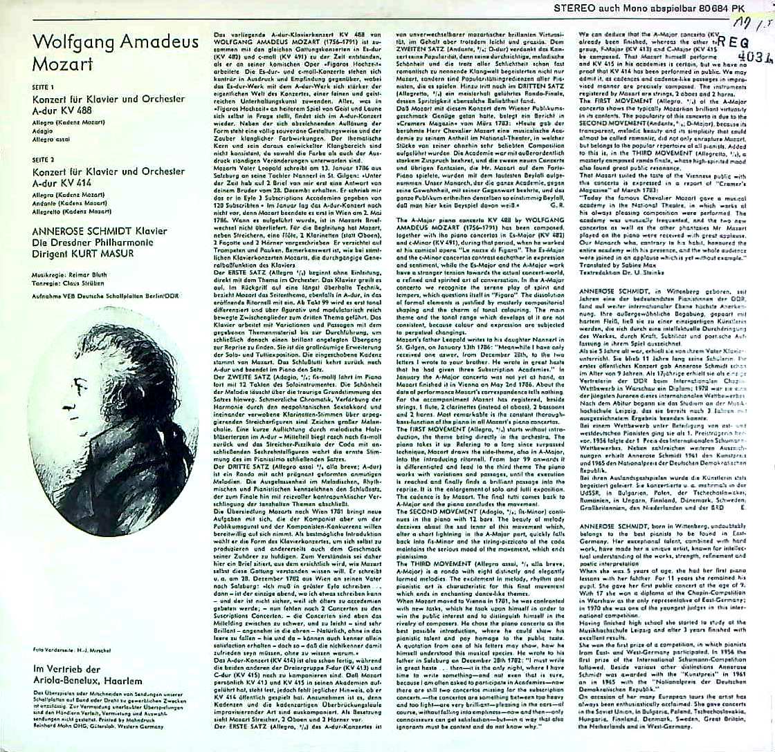 商品コード:REG-4031n[蘭EURODISC] A.シュミット(pf) / モーツァルト:Pf協奏曲23番K.488, 12番K.414