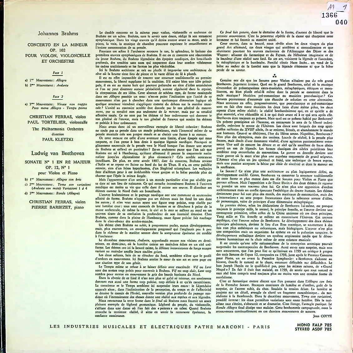 商品コード:1366-040[VSM] C.フェラス(vn) P.トルトゥリエ(vc) / ブラームス:Vn・Vcのための二重協奏曲, ベートーヴェン:Vnソナタ1番