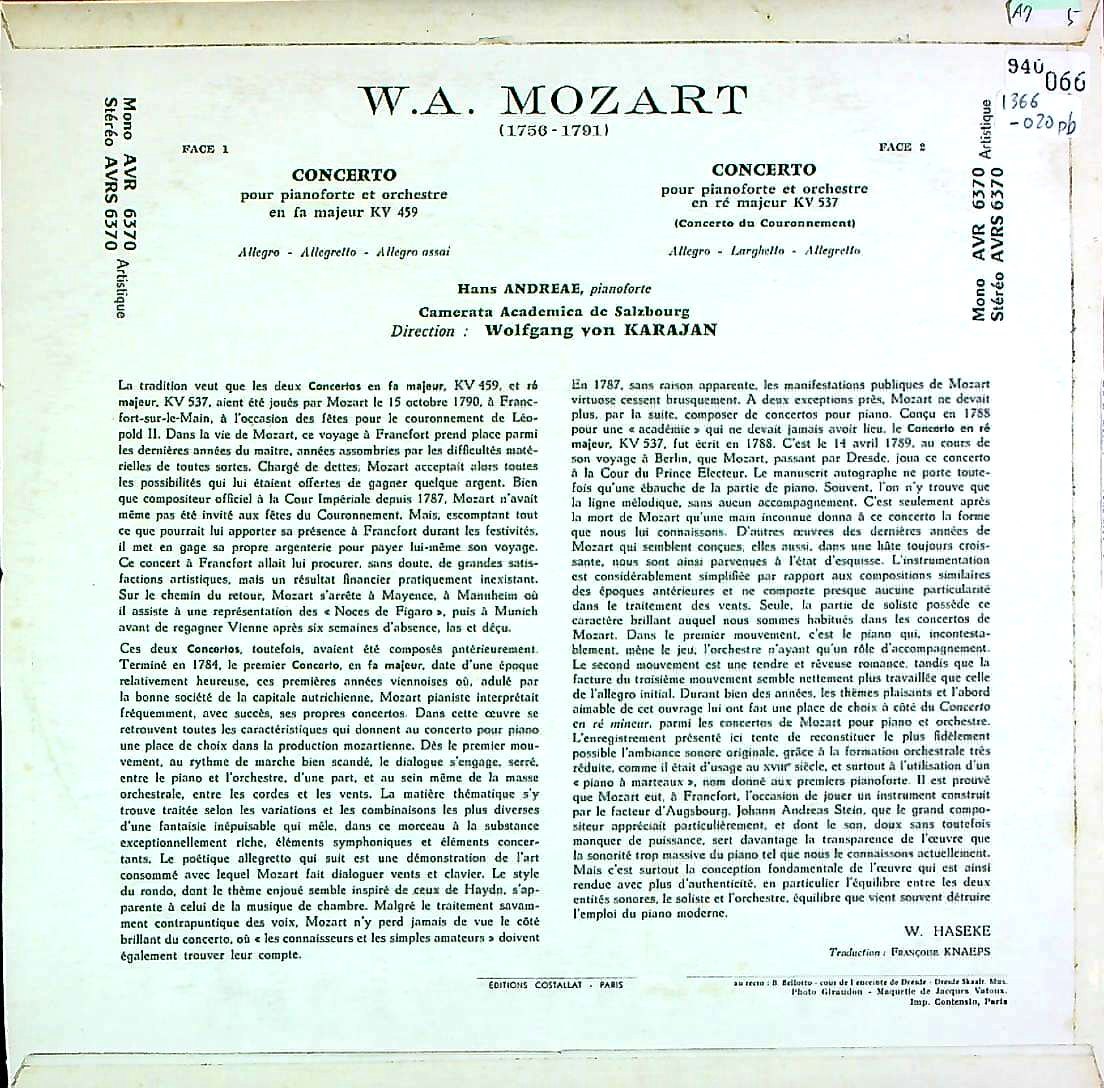 商品詳細:オーストリアAMADEOの録音。指揮はカラヤンの2歳年長の兄でシャルランにOrgで「フーガの技法」を入れたヴォルフガング・フォン・カラヤン(1906-1987)。ピアノは「ヴォルフガング・フォン・カラヤン・オルガン・アンサンブル」のメンバーであるハンス・アンドレーエ(1908-1978)。スイスのピアニスト、チェンバロ奏者、オルガニスト、音楽教師である。1935年にチューリッヒ音楽院のピアノとチェンバロの教授であるとともに、トーンハレ管弦楽団にチェンバロ奏者兼ピアニストとして活動した。ここではモーツァルト時代のハンマー・クラヴィーアを使用。モーツァルトの生家の楽器かも知れない。はっきり言って、有名な弟より兄カラヤンの方がモーツァルトは良いようだ。コリコリとしたHfの音は硬質で、曲の成り立ちにまで遡れる。録音が良く、素晴らしい響き。後期曲のピアノ・フォルテ録音は少ない。ヴォルフガング・フォン・カラヤンはオルガニストとしての教育を受け、また自然科学の経歴を歩み、ウィーン工科大学の電気工学科を卒業し、ザルツブルクで応用物理学研究所 (Labor für technische Physik) を運営した。1950年、ハンス・アンドレーエと妻のヘディとともに「ヴォルフガング・フォン・カラヤン・オルガン・アンサンブル」を結成し、世界各地へ演奏旅行に出た。バッハの「フーガの技法」を得意のレパートリーとしていた。これまでヴォルフガング・フォン・カラヤンが指揮者としての録音はなかったが、これが初となるかも知れない。有名な弟の世界的指揮者ヘルベルト・フォン・カラヤンとは正反対の性格らしく、隠遁的な生活を好み、一匹狼のような生涯を送ったと言われている。兄弟はあまり仲が良くなかったらしい。この録音で聴くヴォルフガング・フォン・カラヤンの指揮は軽快であり、こじんまりしたテンポの良い印象。ソロがハンマー・クラヴィーアということもあり、丁度よいサイズ感である。ソロのハンス・アンドレーエはスイス生まれの鍵盤奏者でオルガンを得意としている。詳しい経歴は不明だが1951年にConcert Hallへバッハの協奏曲録音があり年配の音楽家と思われる。ここでのソロは快活で非常に聴きやすい。