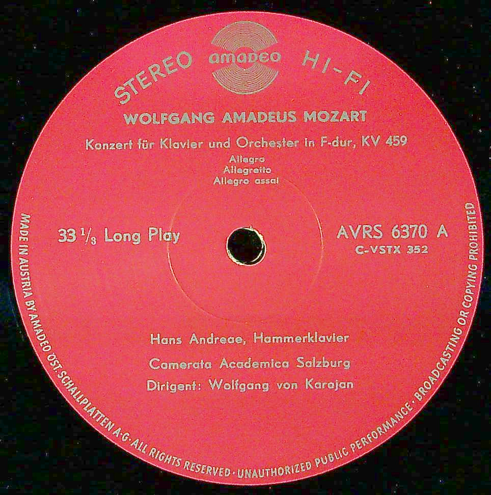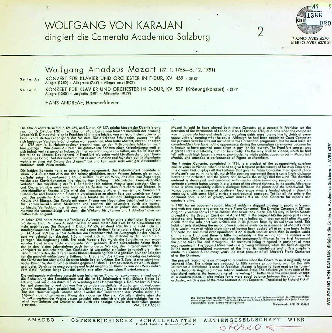 商品詳細:オーストリアAMADEOの録音。指揮はカラヤンの2歳年長の兄でシャルランにOrgで「フーガの技法」を入れたヴォルフガング・フォン・カラヤン(1906-1987)。ピアノは「ヴォルフガング・フォン・カラヤン・オルガン・アンサンブル」のメンバーであるハンス・アンドレーエ(1908-1978)。スイスのピアニスト、チェンバロ奏者、オルガニスト、音楽教師である。1935年にチューリッヒ音楽院のピアノとチェンバロの教授であるとともに、トーンハレ管弦楽団にチェンバロ奏者兼ピアニストとして活動した。ここではモーツァルト時代のハンマー・クラヴィーアを使用。モーツァルトの生家の楽器かも知れない。はっきり言って、有名な弟より兄カラヤンの方がモーツァルトは良いようだ。コリコリとしたHfの音は硬質で、曲の成り立ちにまで遡れる。録音が良く、素晴らしい響き。後期曲のピアノ・フォルテ録音は少ない。ヴォルフガング・フォン・カラヤンはオルガニストとしての教育を受け、また自然科学の経歴を歩み、ウィーン工科大学の電気工学科を卒業し、ザルツブルクで応用物理学研究所 (Labor für technische Physik) を運営した。1950年、ハンス・アンドレーエと妻のヘディとともに「ヴォルフガング・フォン・カラヤン・オルガン・アンサンブル」を結成し、世界各地へ演奏旅行に出た。バッハの「フーガの技法」を得意のレパートリーとしていた。これまでヴォルフガング・フォン・カラヤンが指揮者としての録音はなかったが、これが初となるかも知れない。有名な弟の世界的指揮者ヘルベルト・フォン・カラヤンとは正反対の性格らしく、隠遁的な生活を好み、一匹狼のような生涯を送ったと言われている。兄弟はあまり仲が良くなかったらしい。この録音で聴くヴォルフガング・フォン・カラヤンの指揮は軽快であり、こじんまりしたテンポの良い印象。ソロがハンマー・クラヴィーアということもあり、丁度よいサイズ感である。ソロのハンス・アンドレーエはスイス生まれの鍵盤奏者でオルガンを得意としている。詳しい経歴は不明だが1951年にConcert Hallへバッハの協奏曲録音があり年配の音楽家と思われる。ここでのソロは快活で非常に聴きやすい。