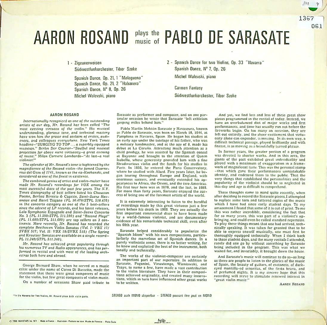 商品詳細:これはオリジナルカップリングではない。VOX録音のアーロン・ロザンドによるオーケストラ付きの4曲入り作品集であるVOX:PL 11600/STPL 511600、仏VOX:GBY 11600/ST GBY 511600(米盤が入る)~サラサーテのツィゴイネルワイゼンOp. 20 -1とピアノ伴奏の「サラサーテ作品集」8曲入りPL 12760/STPL 512760~数曲、更には別の音源から「カルメン幻想曲」などサラサーテ作品を集めて制作した既音源からの企画盤である。オーケストラ伴奏とピアノ伴奏の有名曲の両方が聴ける「サラサーテベスト盤」という趣向になっている。オリジナルは数枚に亘るが、このような企画盤も一般の方には重宝したLPといえる。サラサーテを得意としたアーロン・ロザンドを1枚で無駄なく愉しむならお勧めしたい企画盤。アーロン・ロザンド( 1927- 2019)は米国インディアナ州ハモンドの生まれ。両親はそれぞれポーランドおよびロシアからの移民であった。10歳でフレデリック・ストックの指揮するシカゴ交響楽団とフェリックス・メンデルスゾーンのヴァイオリン協奏曲を演奏して注目を集め、1940年からシカゴ音楽大学のレオン・サメティーニの下で研鑽を積んだ。1944年にカーティス音楽院に転学してエフレム・ジンバリストに師事し、1948年にニューヨークでデビューを果たした。1958年にはカーネギー・ホールで初リサイタルを開き、1960年にレナード・バーンスタイン指揮のニューヨーク・フィルハーモニックでソロデビューした。演奏活動の傍らで、1981年から母校のカーティス音楽院、1986年からマネス音楽学校のそれぞれで教鞭を執るようになり、ザルツブルクやニースなどの夏期講習の講師や世界各地の国際コンクールの審査員として数多く招聘された。1950年代から1741年製のグァルネリ・デル・ジェス「エクス・コハンスキ」を使用していたが、2009年に77年間の演奏活動から退いたときに1000万ドルでロシアの富豪に売却し、うち150万ドルを母校のカーティス音楽院に寄付した。2019年5月、教職からの引退を発表し、カーティス音楽院から名誉博士号を授与された。2019年7月9日、肺炎によりニューヨーク州で92歳で死去した。晩年は来日も多く、日本でも人気の高いヴァイオリン奏者だった。録音の大半がVOXで、ギトリス、バルヒェット、ラウネンバッハーらとの人気を分け合った大物ソリストである。スタイルはフランコ=ベルギー楽派とロシア楽派の双方の流れを汲む。ナタン・ミルシテインやヘンリク・シェリングらの支援により19世紀ロマン派の音楽に関して豊かな見識を持っていたロザンドに目を留めたのがVOXレーベルで、VOXと契約したことで名声を得る。ロザンドが最も敬愛していたのはドイツ/オーストリア音楽で、1961年にはベートーヴェンのヴァイオリン・ソナタ全集をVOXに録音している。ふんだんに19世紀風の技巧を駆使し、それを存分に活かした演奏でサラサーテも数枚録音している。それらを1枚に纏めたものが当LPである。なお「ツィゴイネルワイゼン」と「カルメン幻想曲」はピアノ伴奏版も存在するが、原曲はVnと管弦楽のための作品で、ここでは管弦楽版で演奏。スペイン舞曲はOp.21/22/23/26に2曲ずつ分かれて出版されため、通し番号とOp.番号が入り乱れるが、実際はシンプルで通し番号が1番~8番まで8曲あるだけである。2曲ごとにOp.番号が変わることだけ注意。