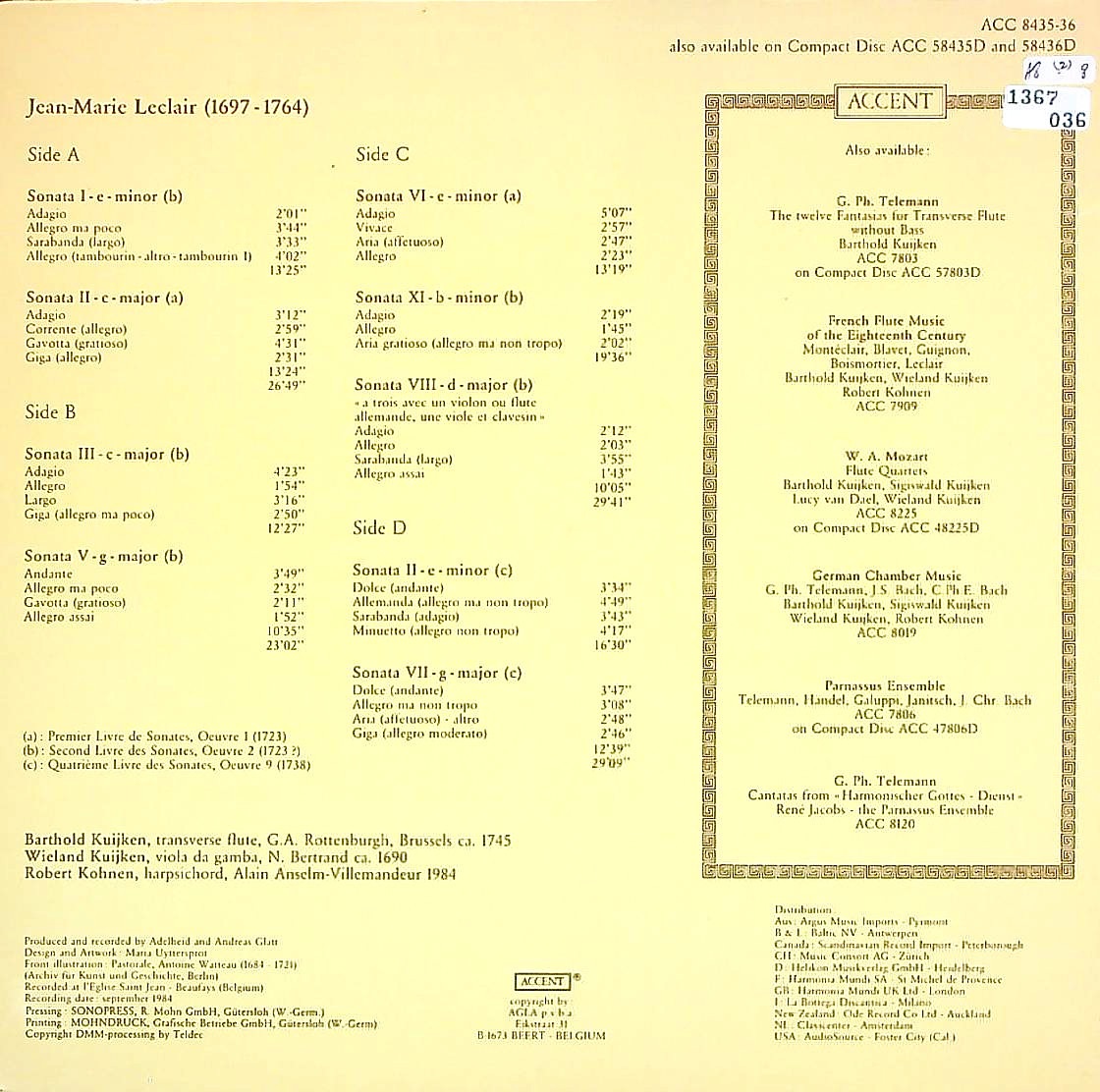 商品コード:1367-036[ACCENT] クイケン兄弟 他/ ルクレール:Flソナタ集(9曲)