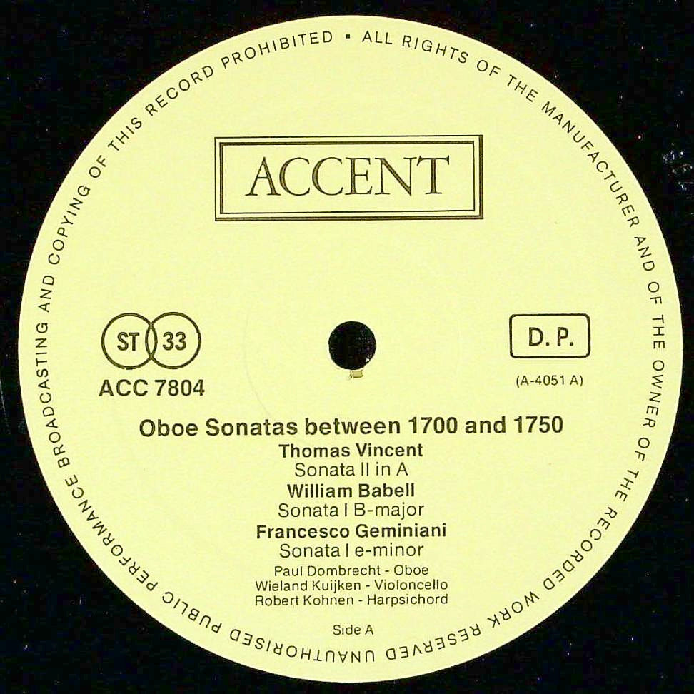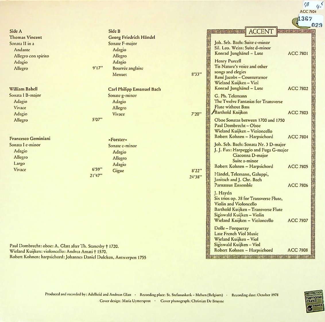 商品コード:1367-029[ACCENT] P.ドンブレシュト(ob) W.クイケン(vc) R.コーエン(cemb) / Obソナタ集/ヴィンセント, バベル 他