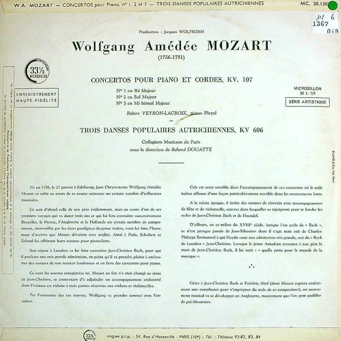 商品詳細:モーツァルト最初のPf協。通し番号は付かず、K.107と表記。それは、1771年モーツァルト15歳の時。 K.107は3曲から成り、ソロ・パートはJ.C.バッハからの借り物ながらJ.C.バッハのPfソナタを拝借して、オーケストラを付けPf協として改作、巧みなオーケストレーションによって、モーツァルトの曲として完成度の高さを見せる。 本人も喜んで演奏したという。年代順としてこのK.107は4番と5番の間に位置する。番外とは言え、ソロピアノは印象的なフレーズで、いかにもモーツァルトらしい曲に仕上がった。ラクロワはプレイエルのモダン・ピアノを使用。この曲の最初期録音と思われる。K.107のトップレベルだろう。思わず顔がほころぶはず。1950年代モノラル録音。1964年にERATOにモノラル/ステレオで再録音(フォルテピアノで演奏)している。わずか15歳の少年の曲に、何故これ程多くの録音が集まる? この初回録音の指揮のロラン・ドゥアット (1922-1992)は1952年パリ・コレギウム・ムジクムを創設した。また1950年代後期にProductions Roland DouatteとしてCritèreというレーベルを仲間とともに創設している。Critèreでは多くの録音をプロデュースしている。この録音はCritèreを立ち上げる以前の指揮者として出演。ヴェイロン・ワクロワはK.107を得意としたようでこの曲に対するシンパシーがあるような印象を受ける。K.107は未出版のまま作曲者の死後に発見され、ケッヘル番号初版で「K.107」の番号が与えられた。そしてブライトコプフ・ウント・ヘルテル監修の旧モーツァルト全集で初めて出版されたが、他の27曲とは違って通し番号は付けられなかった。その後、アルフレート・アインシュタインにより1765年にロンドン・ハーグに滞在中に作曲したと推測され、ケッヘル番号第3版で「K.21b」の番号が与えられた。しかし、自筆譜の研究から1770年~1772年までの間にザルツブルクで作曲されたことが判明し、ケッヘル番号も当初のものに戻された。その後、旧モーツァルト全集で番号が付けられた第1番から第4番までが本作と同様に他者の作品の編曲と判明したが、現在でも本作品の通し番号付けは行われていない。その為他のピアノPf協奏曲と比べ録音の機会は多くない。このモノラル初回録音はほとんど知られていないが、1964年のERATO録音よりソロは厚みがあり優雅である。いかなリステンパルトも時代を遡ることは出来なかった。