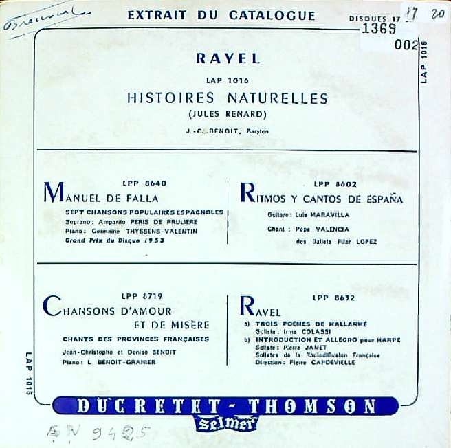 商品コード:1369-002[Ducretet Thomson] J.C.ブノワ(br) J.ルメール(pf) / ラヴェル:歌曲集「博物誌」(全5曲)