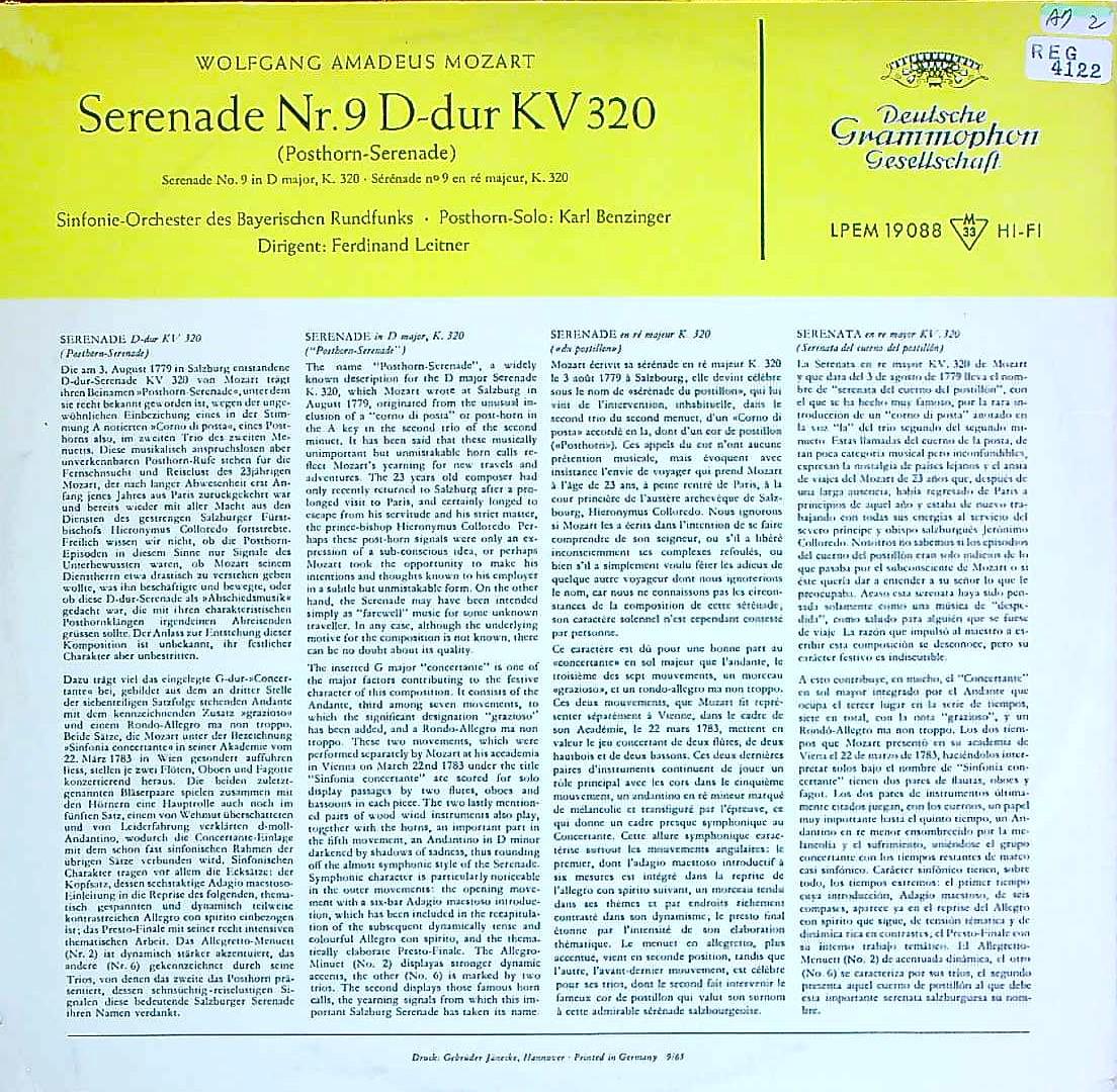 商品コード:REG-4122p[DGG] F.ライトナー/ K.ベンツィンガー(ポストhr) / モーツァルト:セレナーデ9番K.320「ポストホルン」