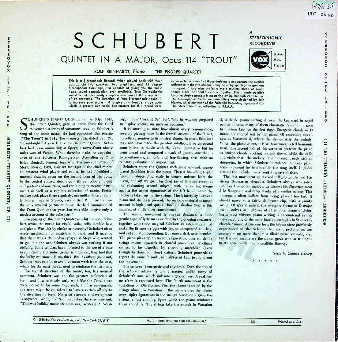 商品コード:1371-061pb[VOX] エンドレスQt.メンバー, R.ラインハルト(pf) 他/ シューベルト:Pf五重奏曲D.667「鱒」