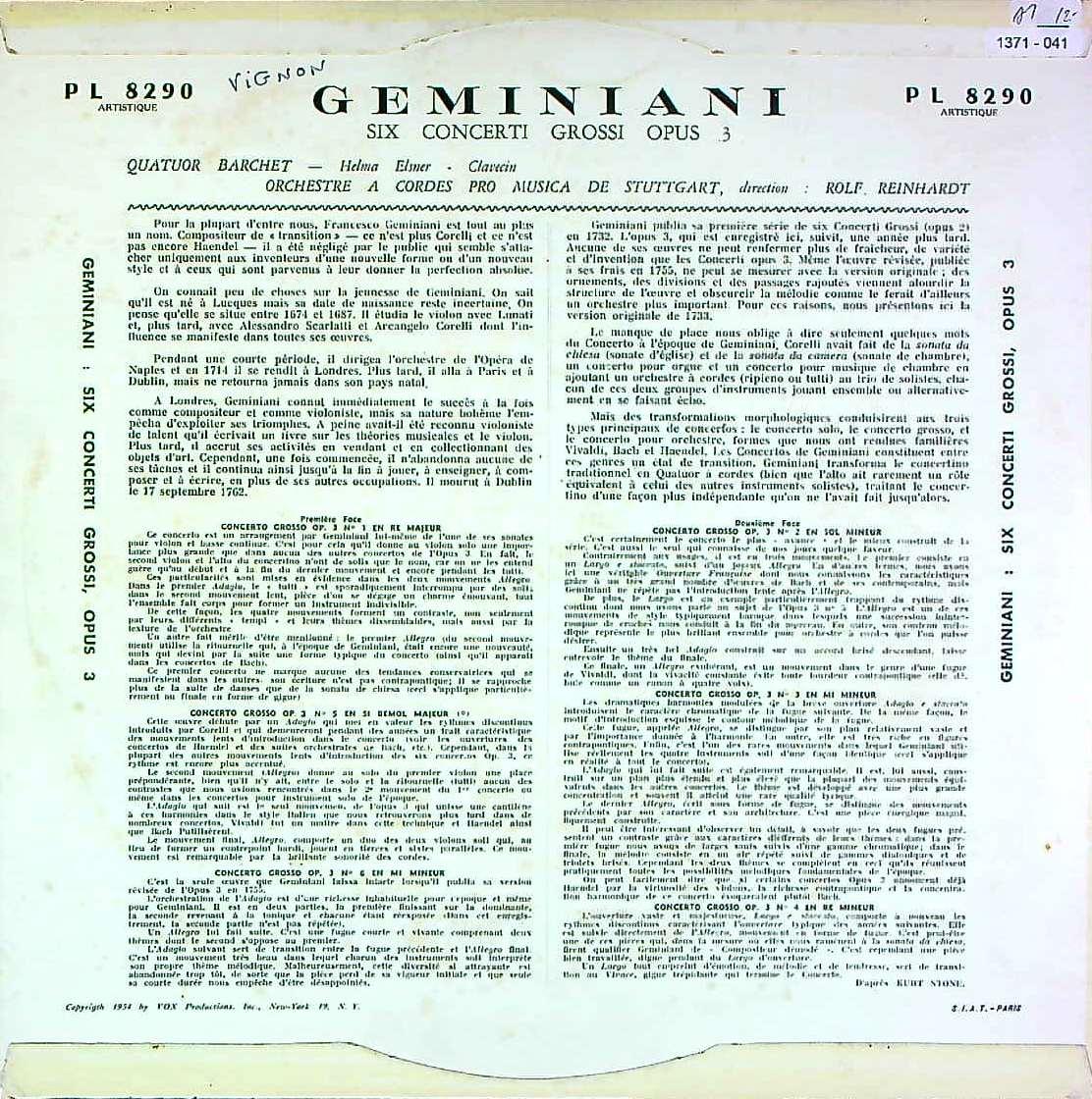 商品コード:1371-041[Pathé-VOX] バルヒェットQt. R.ラインハルト/ ジェミニアーニ:6つの合奏協奏曲Op.3