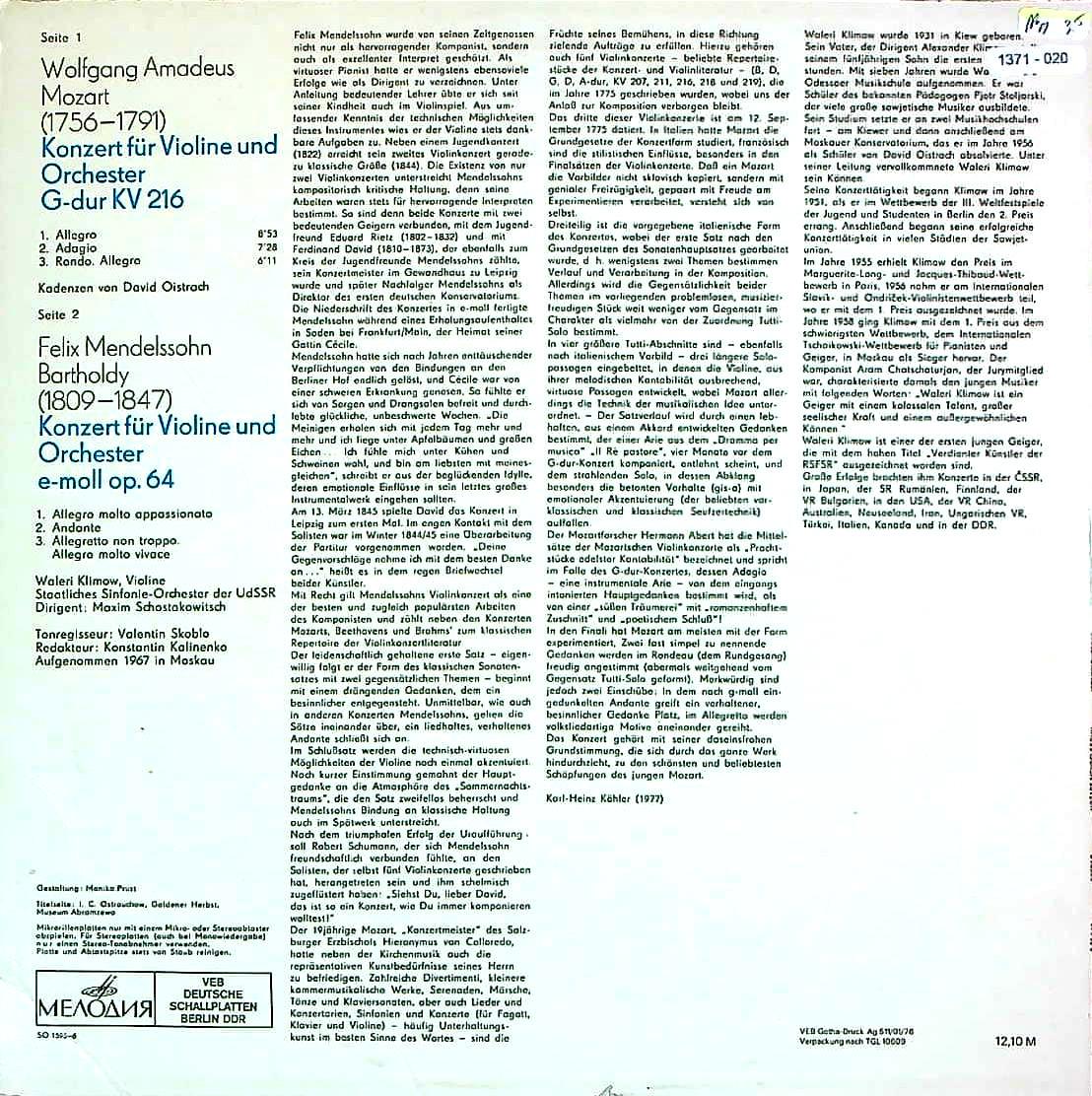 商品コード:1371-020n[ETERNA] W.クリモフ(vn)/ モーツァルト:Vn協奏曲3番K.216, メンデルスゾーン:Vn協奏曲Op.64