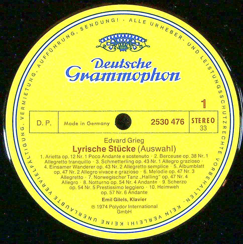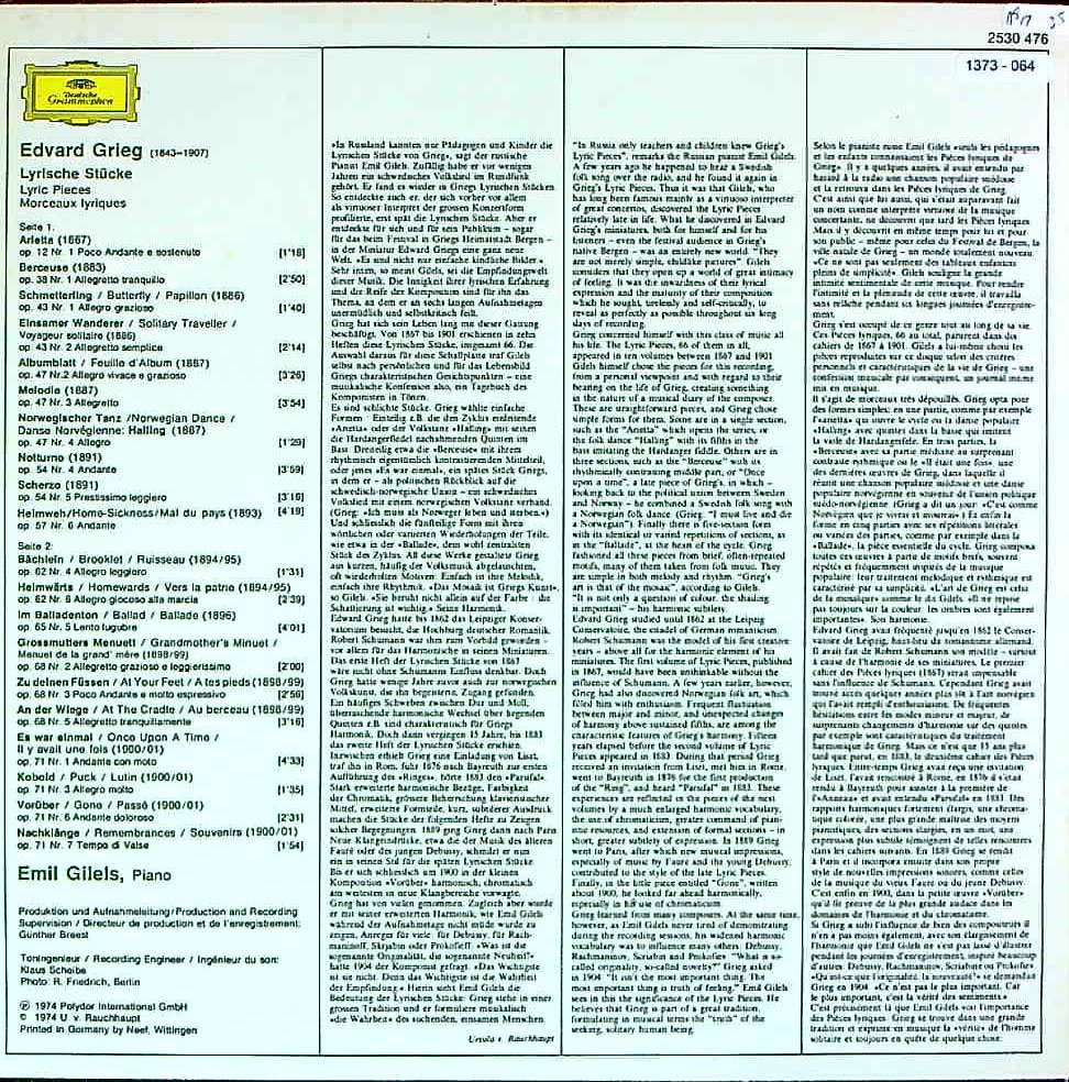 商品コード:1373-064[DGG] E.ギレリス(pf) / グリーグ:抒情小曲集(全10巻/66曲)~抜粋20曲