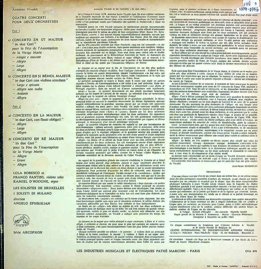 商品詳細:ローラ・ボベスクが参加したブリュッセル・ソリストと、イタリア・ミラノのミラノ・ソリストの混合Ens.と思われる。伊ARCOPHONが音源のようだ。聴けば、ブリュッセルの室内o.を弾き振りしていた頃のボベスクのサウンドそのもの。ソロ部分をボベスクとブリュッセル・ソリストが、そして、バックをミラノ・ソリスト達が担当しているようだ。2つのオケのための協奏曲となっているが、単純に言えば、Vnを主体とした合奏協奏曲のような感じ。全編にわたって、ボベスクのソロが圧倒的で、彼女の為のLPと思って良い。ASDF 891が初出番号。ボベスクの珍しいEMI系録音。イタリア人指揮者アンジェロ・エフリキアンがソリスティ・ディ・ミラノとボベスク率いるソリステ・デ・ブリュッセルの2つの合奏団の合奏で演奏。イタリアで録音されたのかと思っていたが、盤のマトリクスが2YLAなのでフランスで録音された事を意味する為、イタリアとベルギーの両団体がフランスで合流しての録音だったのではと思われる。イタリアからもArcophonレーベルから発売されている。また珍しく英国でも発売された。