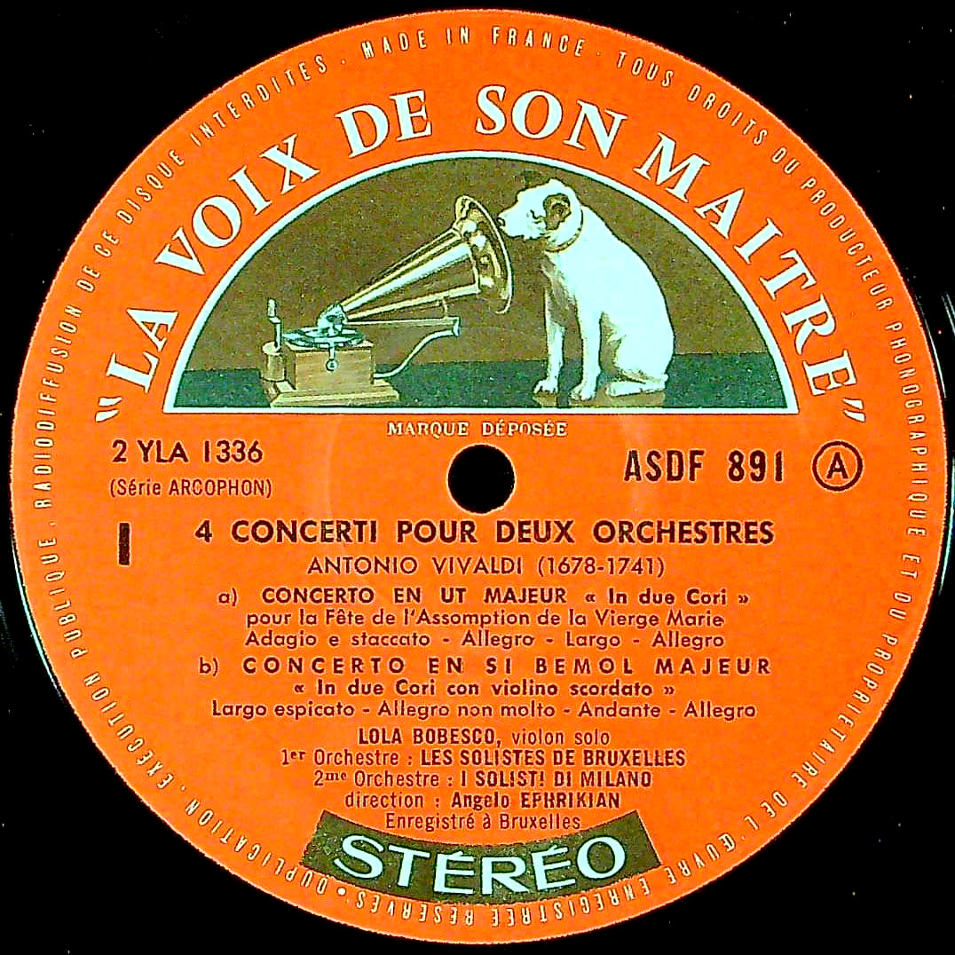 商品詳細:ローラ・ボベスクが参加したブリュッセル・ソリストと、イタリア・ミラノのミラノ・ソリストの混合Ens.と思われる。伊ARCOPHONが音源のようだ。聴けば、ブリュッセルの室内o.を弾き振りしていた頃のボベスクのサウンドそのもの。ソロ部分をボベスクとブリュッセル・ソリストが、そして、バックをミラノ・ソリスト達が担当しているようだ。2つのオケのための協奏曲となっているが、単純に言えば、Vnを主体とした合奏協奏曲のような感じ。全編にわたって、ボベスクのソロが圧倒的で、彼女の為のLPと思って良い。ASDF 891が初出番号。ボベスクの珍しいEMI系録音。イタリア人指揮者アンジェロ・エフリキアンがソリスティ・ディ・ミラノとボベスク率いるソリステ・デ・ブリュッセルの2つの合奏団の合奏で演奏。イタリアで録音されたのかと思っていたが、盤のマトリクスが2YLAなのでフランスで録音された事を意味する為、イタリアとベルギーの両団体がフランスで合流しての録音だったのではと思われる。イタリアからもArcophonレーベルから発売されている。また珍しく英国でも発売された。