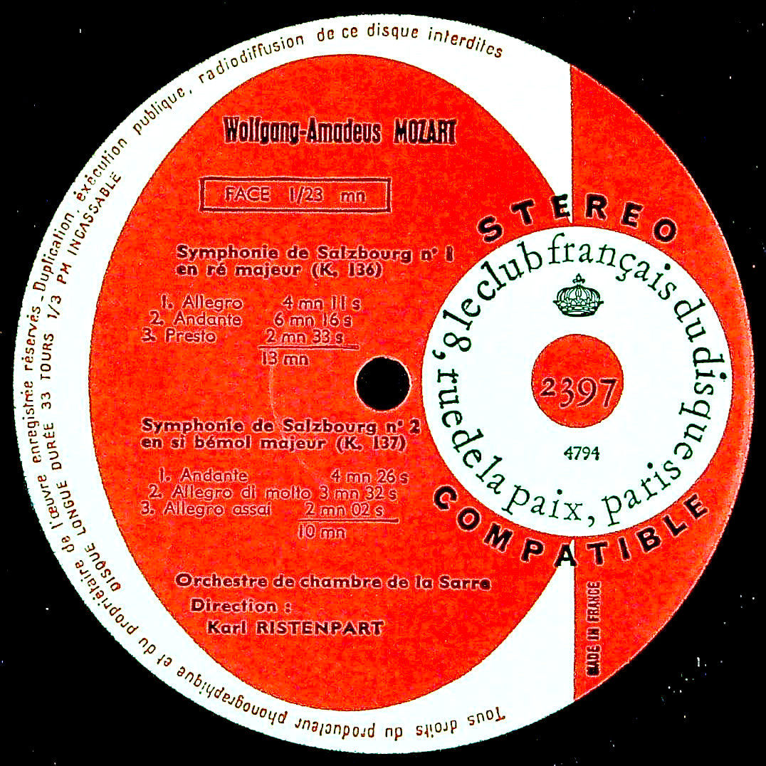 商品コード:1374-021[Club Français] K.リステンパルト/ モーツァルト:ザルツブルク交響曲1~3番