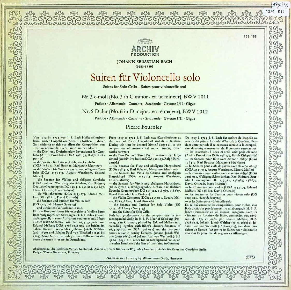 商品コード:1374-011[ARCHIV] P.フルニエ(vc) / バッハ:無伴奏Vc組曲B.1007-1012