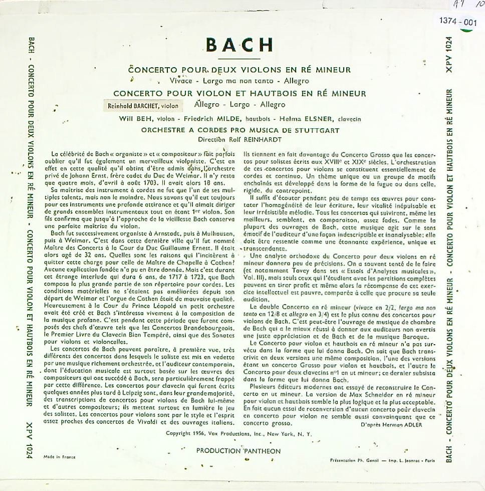 商品コード:1374-001[PANTHEON] R.バルヒェット, W.ベー(vn)/F.ミルデ(ob) 他/ バッハ:2Vn協奏曲B.1043, Vn・Ob協奏曲BWV.1060R