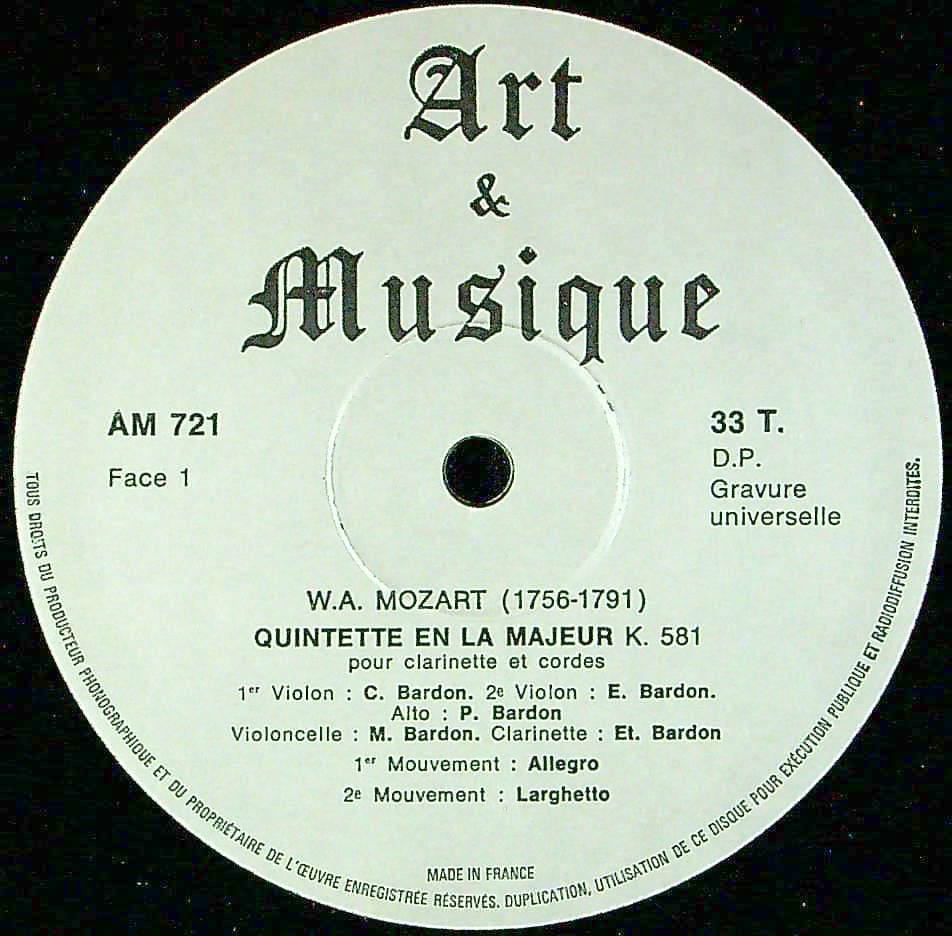 商品詳細:1972年の発売らしいK.581の珍品。両面で1曲入りなので贅沢な溝の使い方になっている。内容も素晴らしいのでモーツァルト好きならば、気になる一枚だろう。仏マイナー・レーベルのArt&Musiqueなるレーベルの入荷自体も初であり、一生に一回お目にかかれるか?という品だ。内容は「珍品イコール名演ならず」の法則をくつがえし、相当に素晴らしい演奏。K.581の勢力地図を変更する必要が出てくるだろう。そして俄かには信じられない話だが、演奏者は全員が兄弟である。調査したところ、西フランスのアンジェにバルドン一族という音楽一家が存在するらしい。長男のピエールはパリ音楽院のフルートと室内楽部門を首席で卒業。その後はオルガンに傾倒し、南仏プロヴァンスにある聖マリー・マドレーヌ教会の正オルガニストを逝去するまでの約60年勤め上げながらプロヴァンス音楽院の教授として両方の楽器の指導を行った。次男のヴァイオリンのクロードはパリ音楽院のヴァイオリン科の首席で、ミュンシュが認めたパリ管の初代コンマス。アメリカで客死したミュンシュの棺を最後まで看取ったことで遺志を引き継ぐべき運命を感じ、デルヴォー、バレンボイムの指導の元に指揮者となった。三男でクラリネットのエティエンヌもパリ音楽院出身で、当然ながらクラリネットと室内楽の首席。ストラスブールpo.の首席クラリネット奏者であり、ストラスブール木管八重奏団の主要メンバーの一人。四男のマルセル(vc)はナヴァラの愛弟子で、これまたパリ音楽院を首席で卒業。マルティヌー:小協奏曲のイタリア初演をナヴァラの依頼で引き受け、後にはナヴァラの推挙でパリ音楽院チェロ科の教授に就任し約50年勤め上げた。この様に、軽く列挙するだけでフランスの音楽界を牽引した恐るべき一族だと分かるだろう。当たり前だが全員が一族という五重奏団はこれまで見たことがないし、結束力という点ではこれに勝る団体はあるまい。更には音楽家同士で結婚した兄弟もいるため、一族から輩出した、あるいは一族に連なる職業音楽家は三十人を超えるらしく、究極はバルドン一家名義でヴィヴァルディの四季(最低でも弦楽器奏者だけで12人!)のLPも出している。冗談めいていて出来の悪い小説か漫画の様だが、長兄の訃報の際に新聞に取り上げられている、歴とした事実である。内容に忖度をする気は毛頭ないにせよ、今後はバルドンの姓に注視していかざるを得ないだろう。当盤は直系の兄弟でのアンサンブルのため当然ながらチームワークやコンビネーションに疑念の余地はなく、個々の一流音楽としての才覚と、一族としての血脈や魂の繋がりが両立した素晴らしい演奏となっている。その存在感は強力で、小さな交響曲を聴いているような錯覚を覚える。デリカシーが溢れ、モーツァルト的な生命観の表現も抜群である。名演の多いK.581という曲だが、その中でも一際光るものがある1枚。レア度においてもトップレベルである。思わず顔がほころぶ超掘り出し物。五重奏団としての録音は当盤以外に1983年リリースのブラームスが存在するらしい。