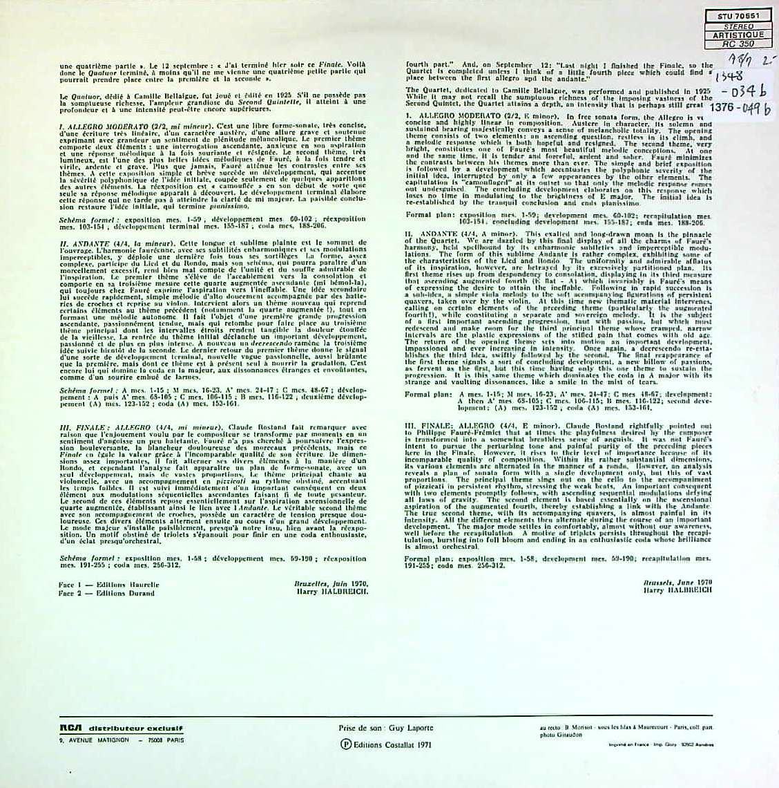 商品詳細:STU 70550-4の全5枚でフォーレの室内楽を極めた、ERATOで初の室内楽全集録音。同じ頃、VSMでもコラール達によって同種の企画が進められたが、ユボー、ナヴァラが居るERATOの方が、よりフォーレらしい感覚を持っている。残念ながら全5枚揃えることは難しい。フォーレの室内楽は演奏が良ければ聴くほどに味わいが深まり、理解が進む曲である。今まで纏まった録音がなかったのが不思議。初出の紺白レーベルは近年では超が付く希少盤。1970年代とはいえこれまでERATOでさえ纏まった全集録音がないのが現状であった。この録音はパリ音楽院室内楽科教授のジャン・ユボーを中心にしたフランスの精鋭たちが録音、史上初となった全集である。ガブリエル・フォーレ( 1845 - 1924)の生誕125周年、没後45周年に当たり、それまで録音を待っていたのではないかと思われる。遅きに感じるがそれでもERATOというフランスを代表するレーベルが手掛けた室内楽全集録音は録音当時の最高ランクの演奏であることは間違いのない事実である。CALLIOPEのラヴェルの室内楽全集録音とともに1970年代の代表する傑作シリーズである。このシリーズ録音は仏ACCディスク大賞を受賞した。室内楽全集には様々な器楽奏者が必要となる為、1960年代まではキャストの効率を重視する意味で作曲家ごとの室内楽全集録音は殆ど企画されなかった。1970年代に入り、レコードの市場規模の拡大と市場の要請によりこのようなシリーズ企画が可能になった。そのような時代背景を理解すれば、録音時期に関しては理解されるだろう。1950-60年代の名手たちによる録音に越したことはないが、歴史とは傍観者の希望には応えてくれないものである。