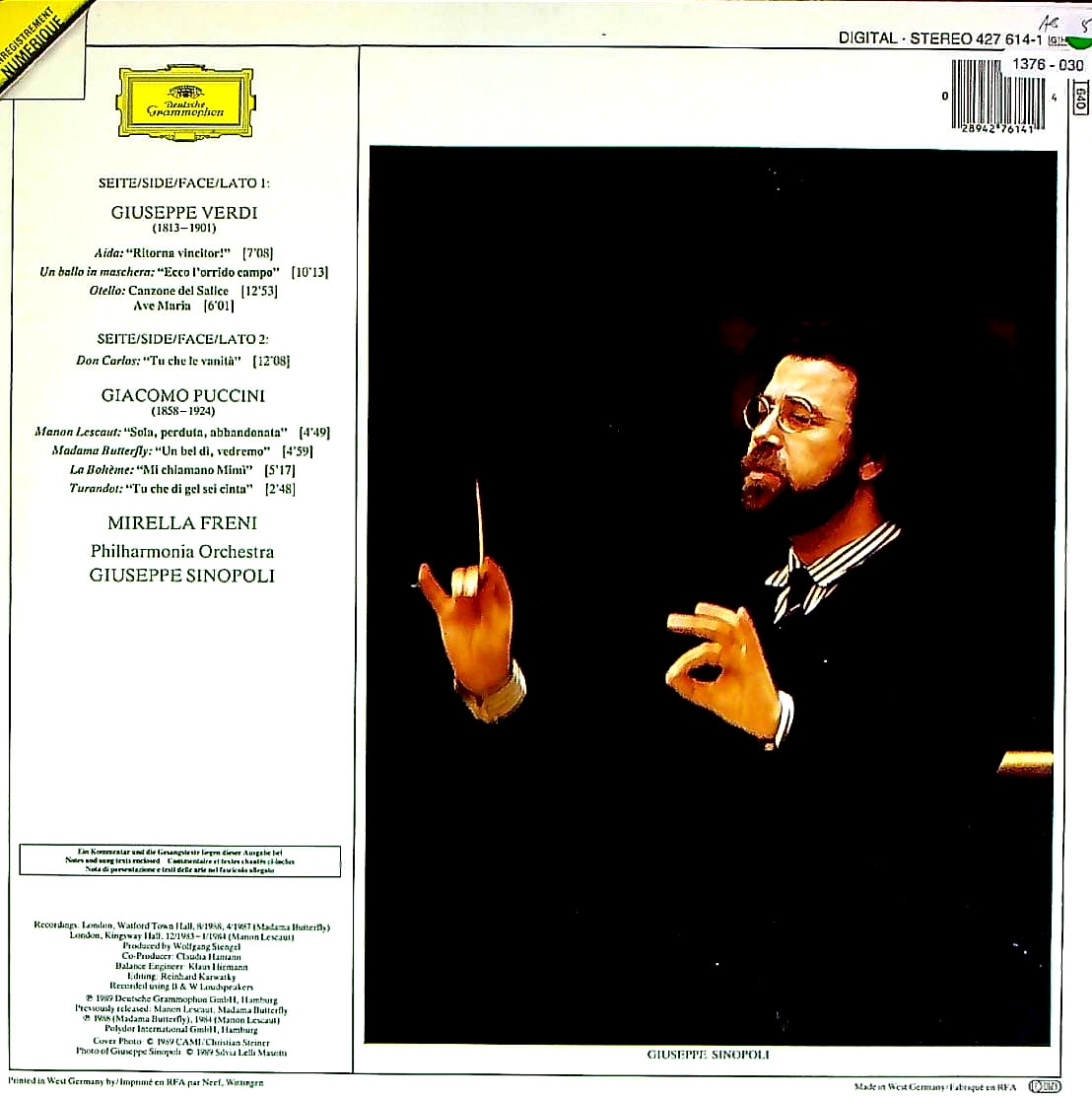 商品詳細:ヴェルディ5曲、プッチーニ4曲のオペラ・アリア集。ミレッラ・フレーニ(1935-)はイタリアのモデナで労働者階級の家庭に生まれたソプラノ歌手。彼女の母親はルチアーノ・パヴァロッティの母親と同じタバコ工場で働いており、同じ乳母の乳で育ったという。彼女は音楽的才能に恵まれ、10歳でラジオ局の主催したコンクールで『ある晴れた日に』(プッチーニの『蝶々夫人』)を歌い優勝した。しかし著名なテノール歌手ベニャミーノ・ジーリは、このまま歌手として歌い続けると早晩喉を痛める危険性があると警告し、もう少し歳をとるまで歌うのを中止したほうがよいと助言した。彼女はこれに従い、17歳までステージで歌わなかった。1955年、19歳のフレーニはモデナの劇場で『カルメン』のミカエラ役でオペラの初舞台を踏んだ。これをきっかけに様々な役柄の出演要請を受けたが、彼女はキャリアを中断して声楽教師レオーネ・マジエラと結婚し、子供を育てる道を選んだ。1958年、フレーニはトリノのテアトロ・レッジオで行われた声楽コンクールでミミを歌って優勝し、演奏活動に復帰した。フレーニの名が世界的に知られるようになったのはグラインドボーン音楽祭でフランコ・ゼッフィレッリの演出による『愛の妙薬』(ドニゼッティ)でアディーナを歌ったことで、彼女は続く1960年から1962年にかけてのシーズンに同地でスザンナ(『フィガロの結婚』)とツェルリーナ(『ドン・ジョヴァンニ』)を演じた。その後はカラヤンと共演するなど以後多くのオペラや演奏会で共演を重ねた。1965年には、やはりミミ役でメトロポリタン歌劇場デビューを飾った。1990年イタリア共和国大十字騎士賞、1993年3月にはフランス政府からレジオン・ドヌール勲章を受章した。シノーポリとは1980年代から共演を行い「マノン・レスコー」と「蝶々夫人」をDGGに全曲録音している。当盤の2曲のアリアはその録音からの抜粋だろう。またアバドと「シモン・ボッカネグラ」の全曲録音もしている。このLPはシノーポリとの2曲に7曲加え、計9曲のアリア集としたもの。軽妙な声質の持ち主だったが1970年代から、より重い声質の役柄もこなせる大物歌手に成長した。これは1989年発売の入荷がほとんどないレア・デジタルLP!