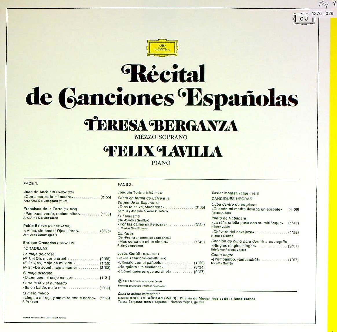 商品コード:1376-029[DGG] T.ベルガンサ(ms)/ スペイン歌曲集/グラナドス, トゥーリナ, モントサルヴァゲ, グリディ 他