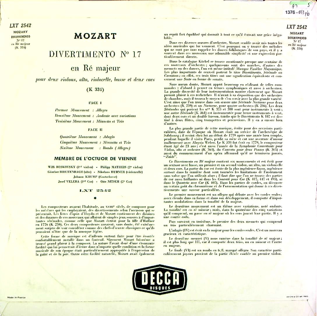 商品コード:1376-013pb[DECCA] ウィーン八重奏団のメンバー(W.ボスコフス 他) / モーツァルト:ディヴェルティメント17番K.334